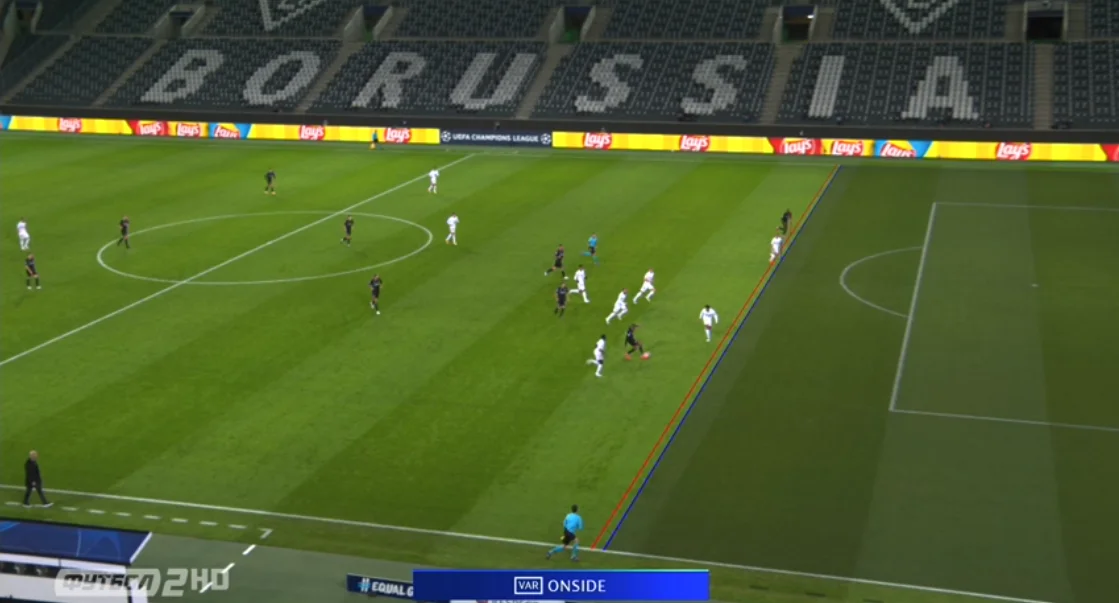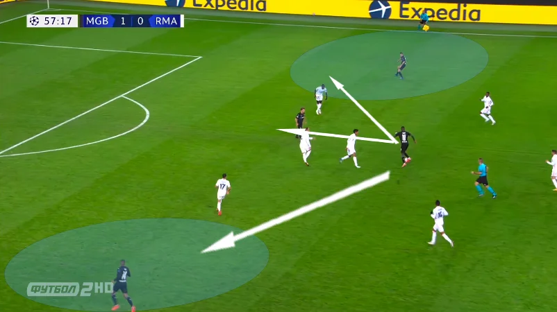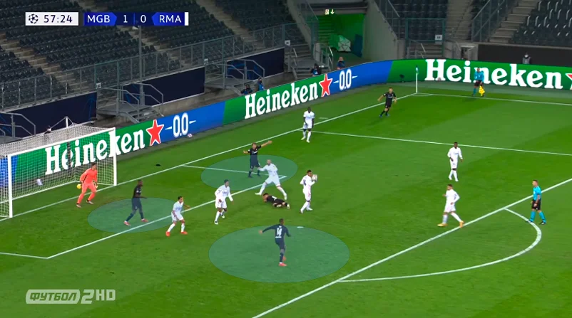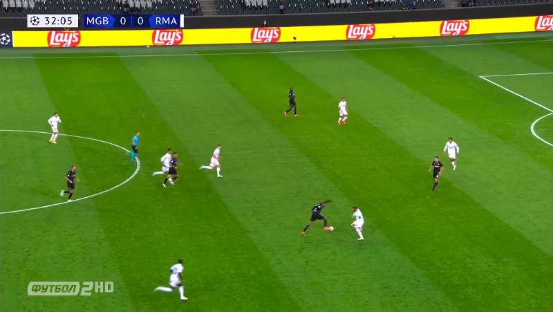 Частково це пояснюється відсутністю профільного правого фулбека у Реалі – обидва колективи явно збиралися використовувати цю слабкість. Загалом же ґладбахці старалися розтягувати захист мадридців як по ширині, так і по вертикалі, користуючись проблемами позиційної гри оборонців та агресивним стилем Рамоса. Так, перший гол став наслідком висмикування Серхіо, якого обіграв Плеа. Грамотне розташування Крамера перед Вараном та широка позиція Тюрама дозволила розкатати комбінацію в три дотики – Рафа ще й пропустив пас між ногами.