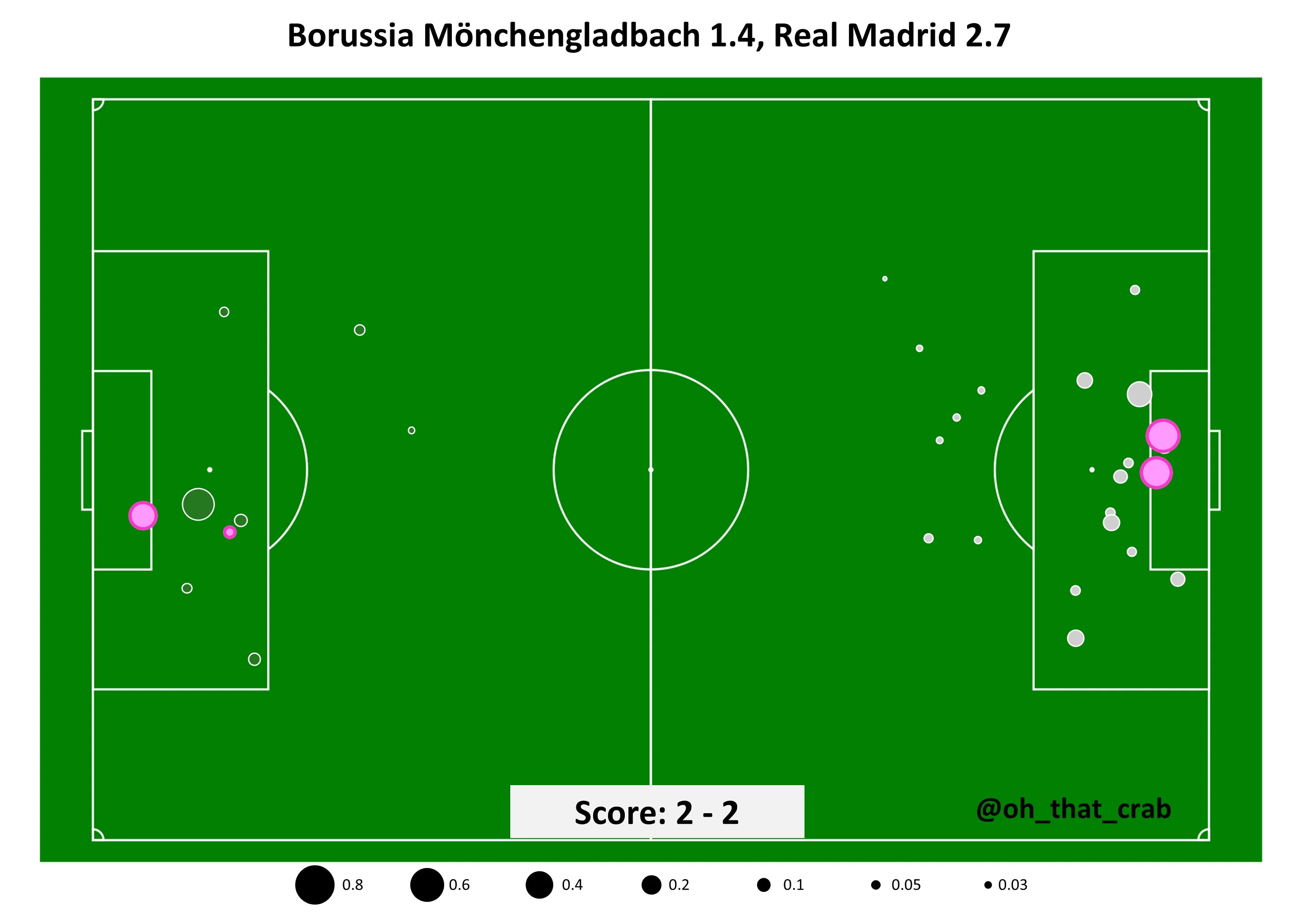 В першу чергу, варто зазначити, що Реал не заслужив на поразку. "Королівський" клуб провів аж 21 удар по воротах (проти 9 у Борусії М) – п'ятнадцять пройшло з меж штрафного. Щоправда, в площину пройшли тільки шість (+стійка), однак за очікуваними голами Мадрид награв аж на 2,7 xG. Про перевагу за просуванням та проникними передачами із ключових зон також говорили. В мінус можна записати тільки слабеньку позиційну роботу, яка не дозволяла покращувати позиції для удару й зажувала більшу частину ендшпілю зустрічі, тож про перемогу "вершкових" мова не йде. Борусія М прочитала Реал, однак програти підопічні Зінедіна Зідана не заслуговували.