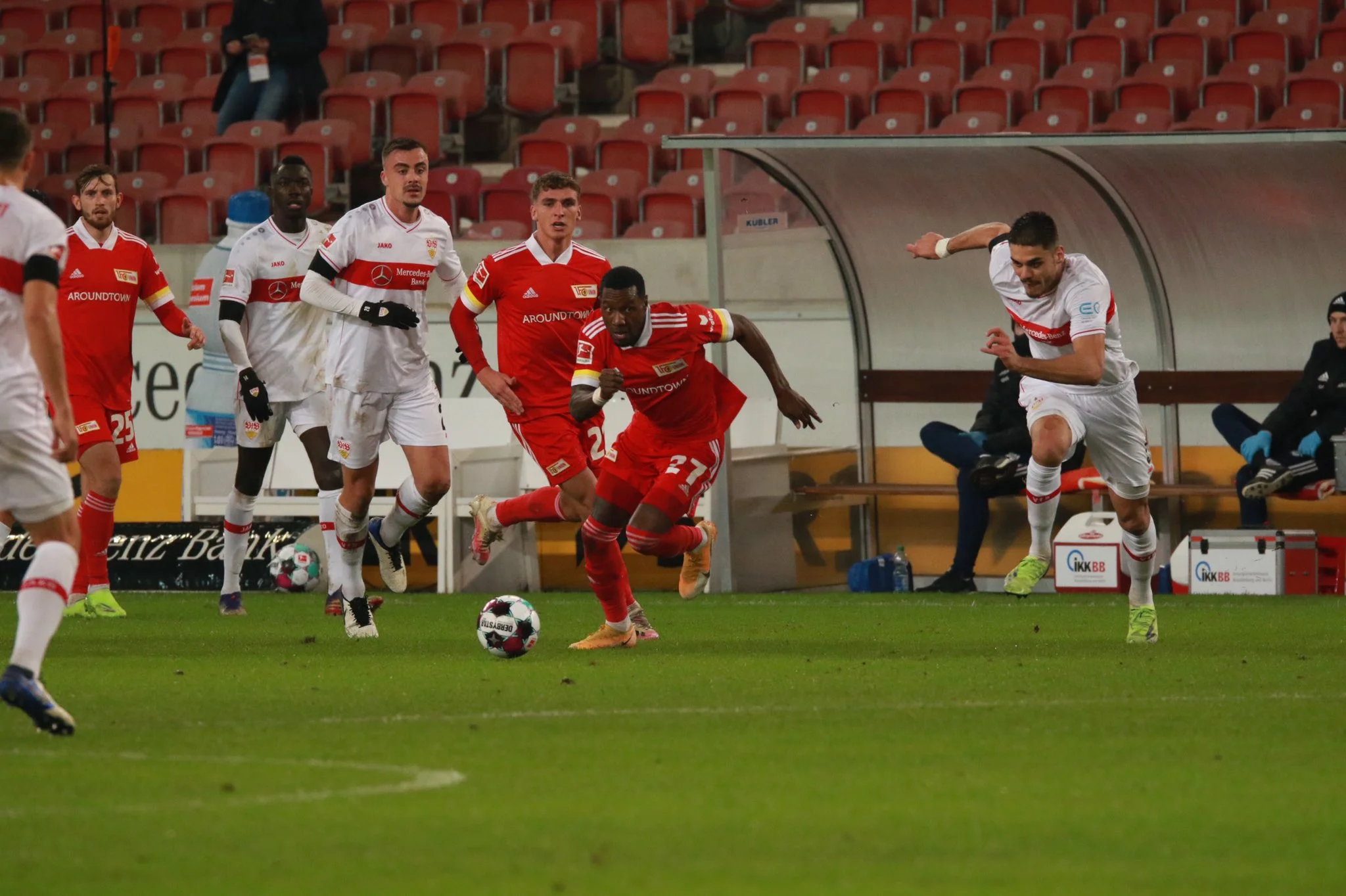 У паралельній зустрічі Штутгарт намагався не оступитись після розгрому Борусії на вихідних, однак у гостей з Уніона на це були свої плани. Берлінці відкрили рахунок вже на 4-й хвилині – це Фрідріх замкнув подачу Тріммеля зі штрафного. Подвоїти перевагу міг Беккер, але його класні удари парирував голкіпер.