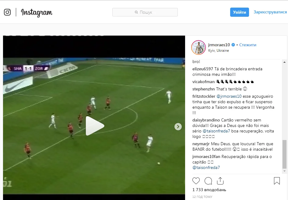 "Боже мій, це божевілля. Це має бути заборонено у футболі. Це неприпустимо", – залишив Неймар коментар під відео фолу, яке на своїй сторінці в Інстаграм виклав нападник Шахтаря Жуніор Мораєс.