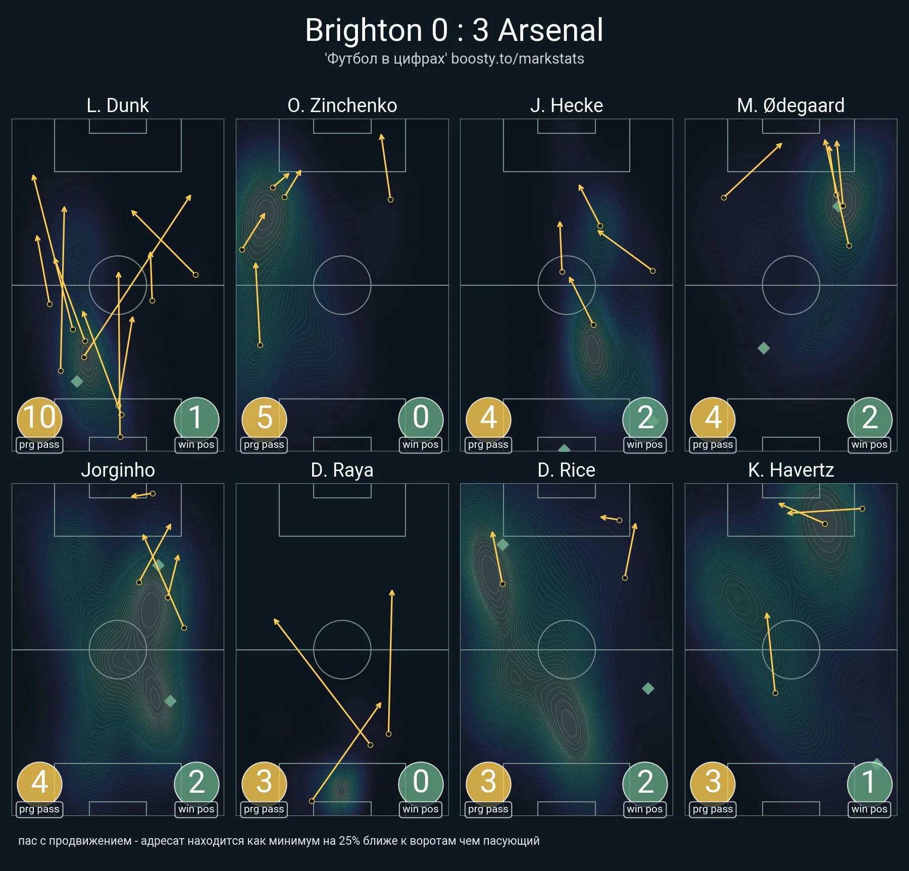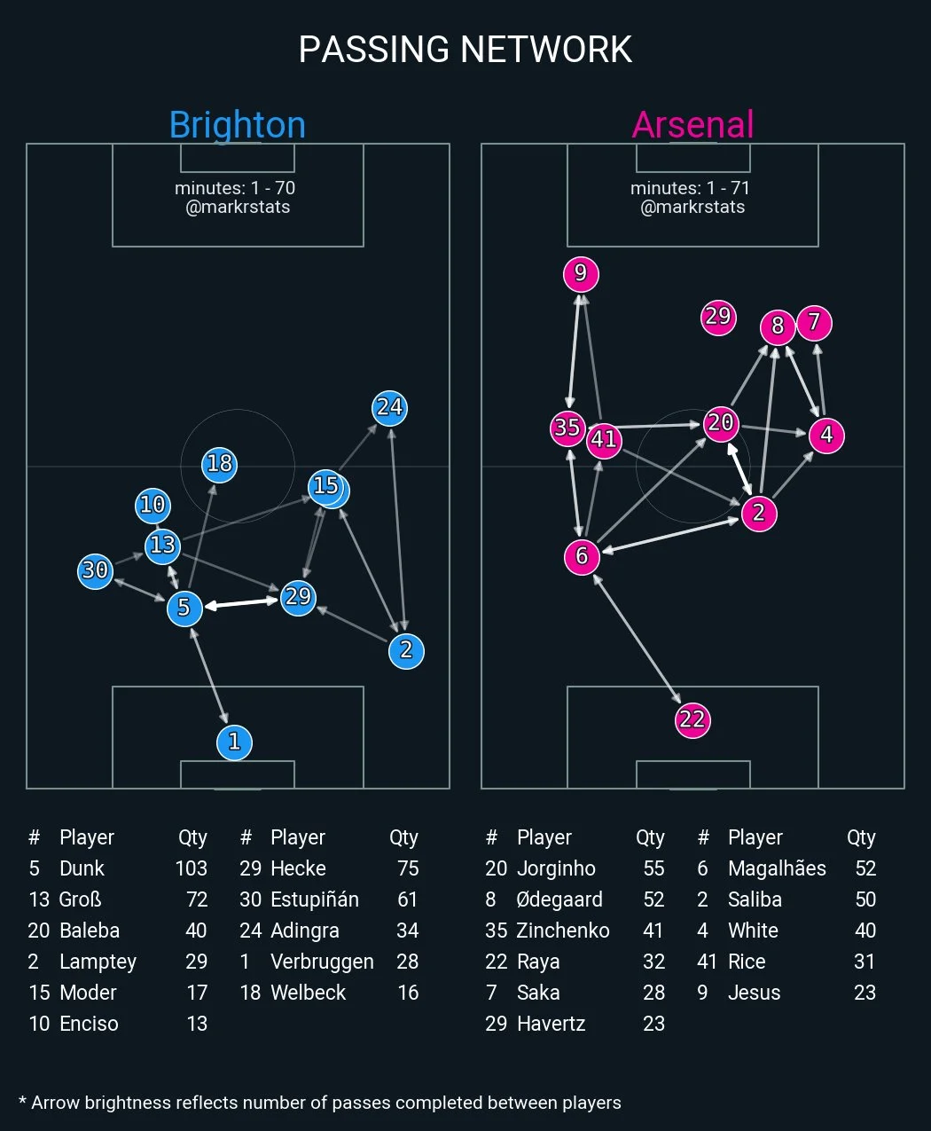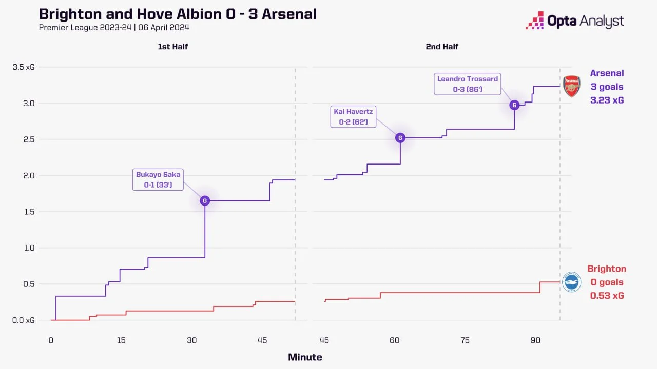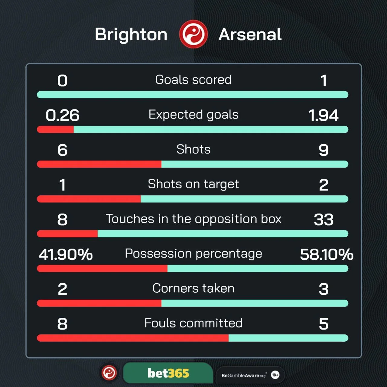 Після цього небезпечних моментів не виникало аж до кінця тайму. Тим не менш, домінування підопічних Мікеля Артети нікуди не зникло. У першому таймі "каноніри" видали 33 дотики до м'яча у карному майданчику (третій найкращий показник у сезоні АПЛ) проти 9-ти у Брайтона. Навіть без урахування пенальті вони мали у 4 рази вищий xG.