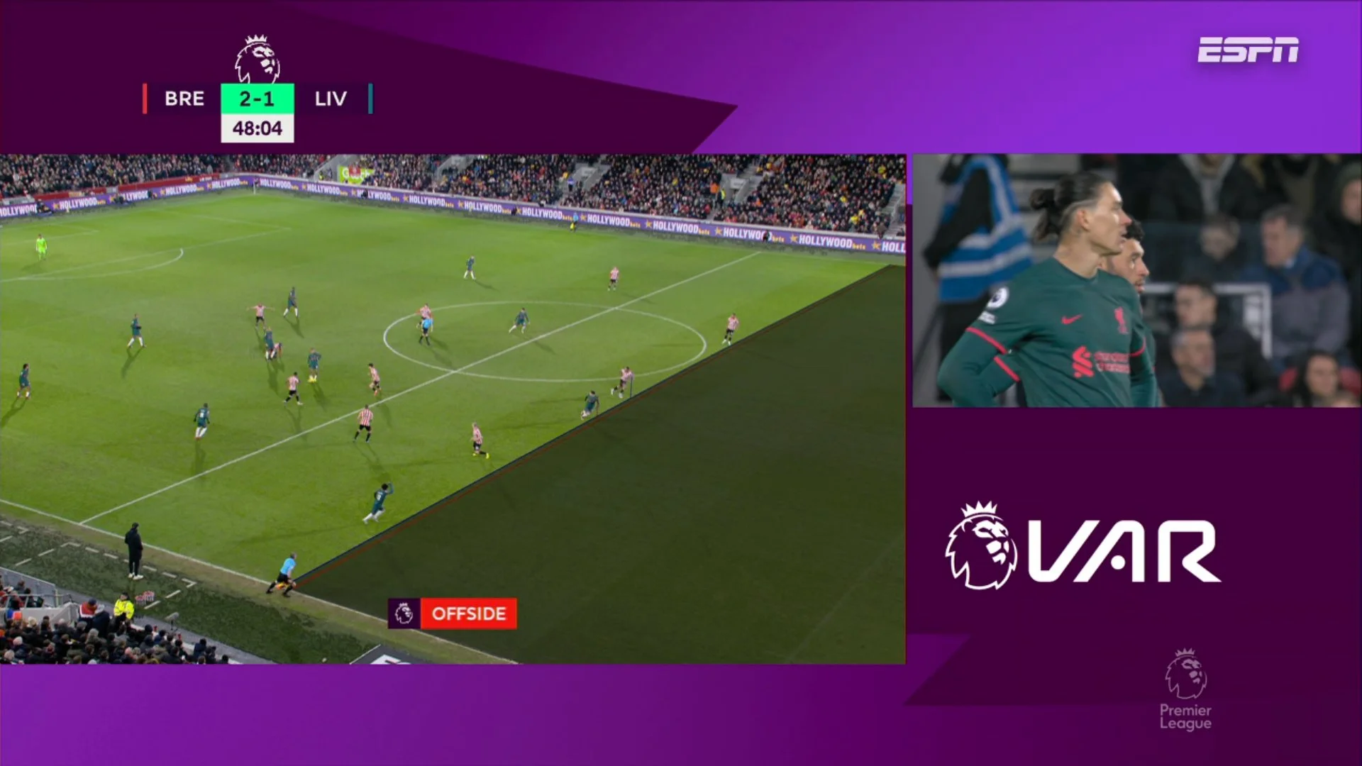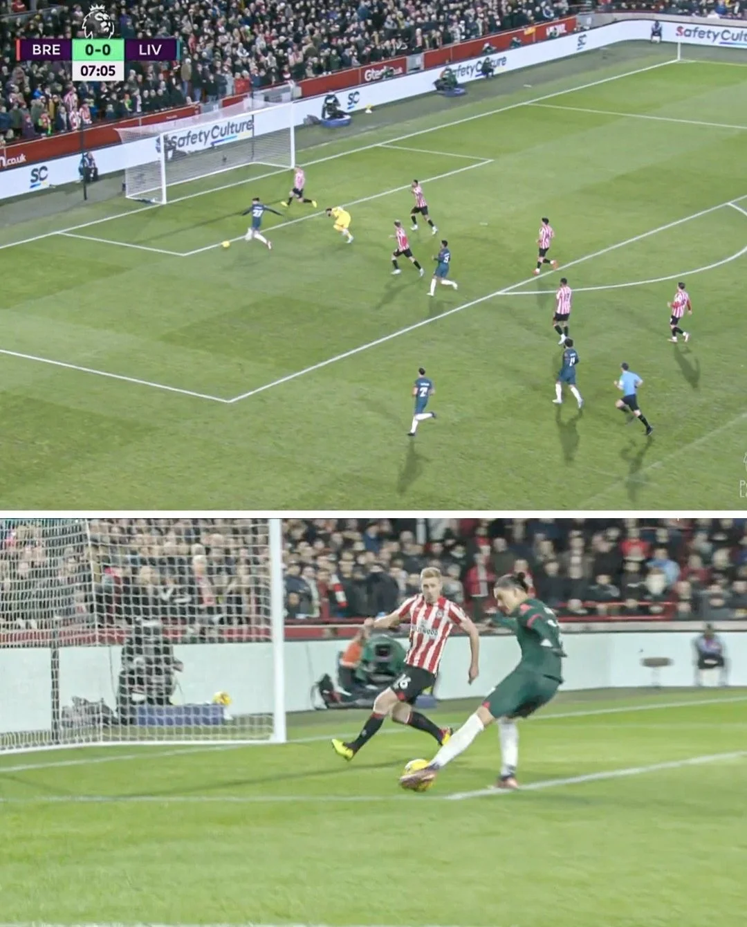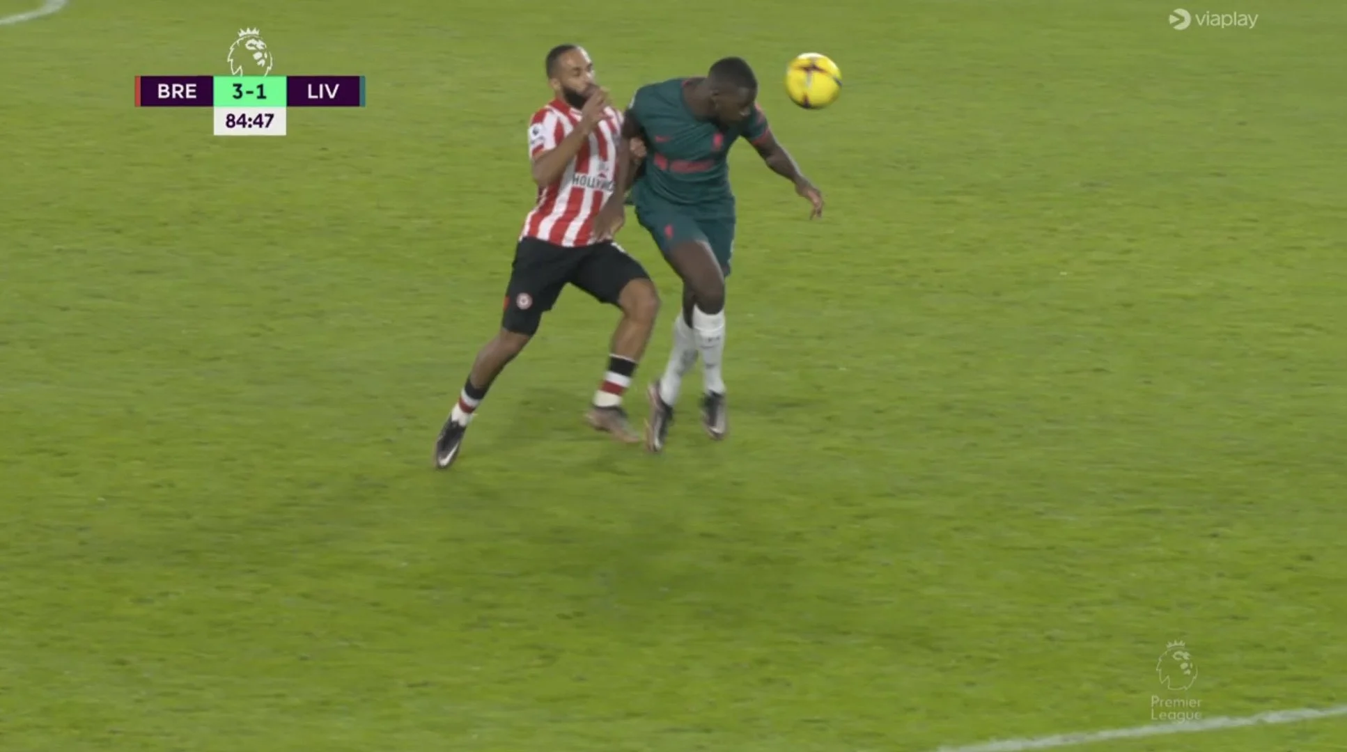 Зрештою, Ліверпуль догрався. На 84-й хвилині Кейта втратив м'яч у боротьбі з Янельтом, а Ньоргор підхопив м'яч і з власної половини запустив діагональ на Мбеумо. Конате був першим на м'ячі й прикривав його, але після легкого контакту з Брайаном француз втратив рівновагу й впав! Форвард Брентфорда вийшов віч-на-віч і переграв Аліссона – 3:1!