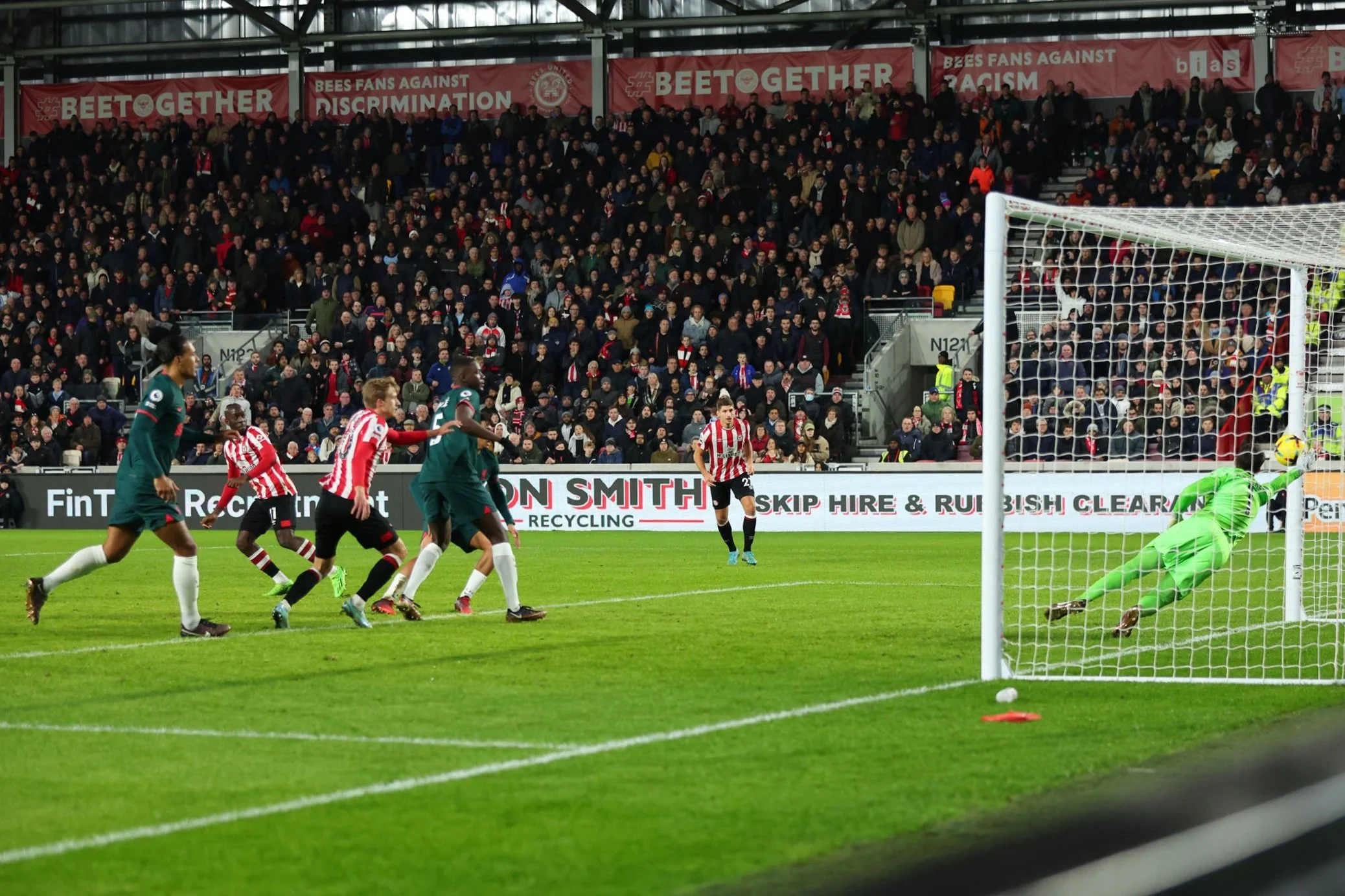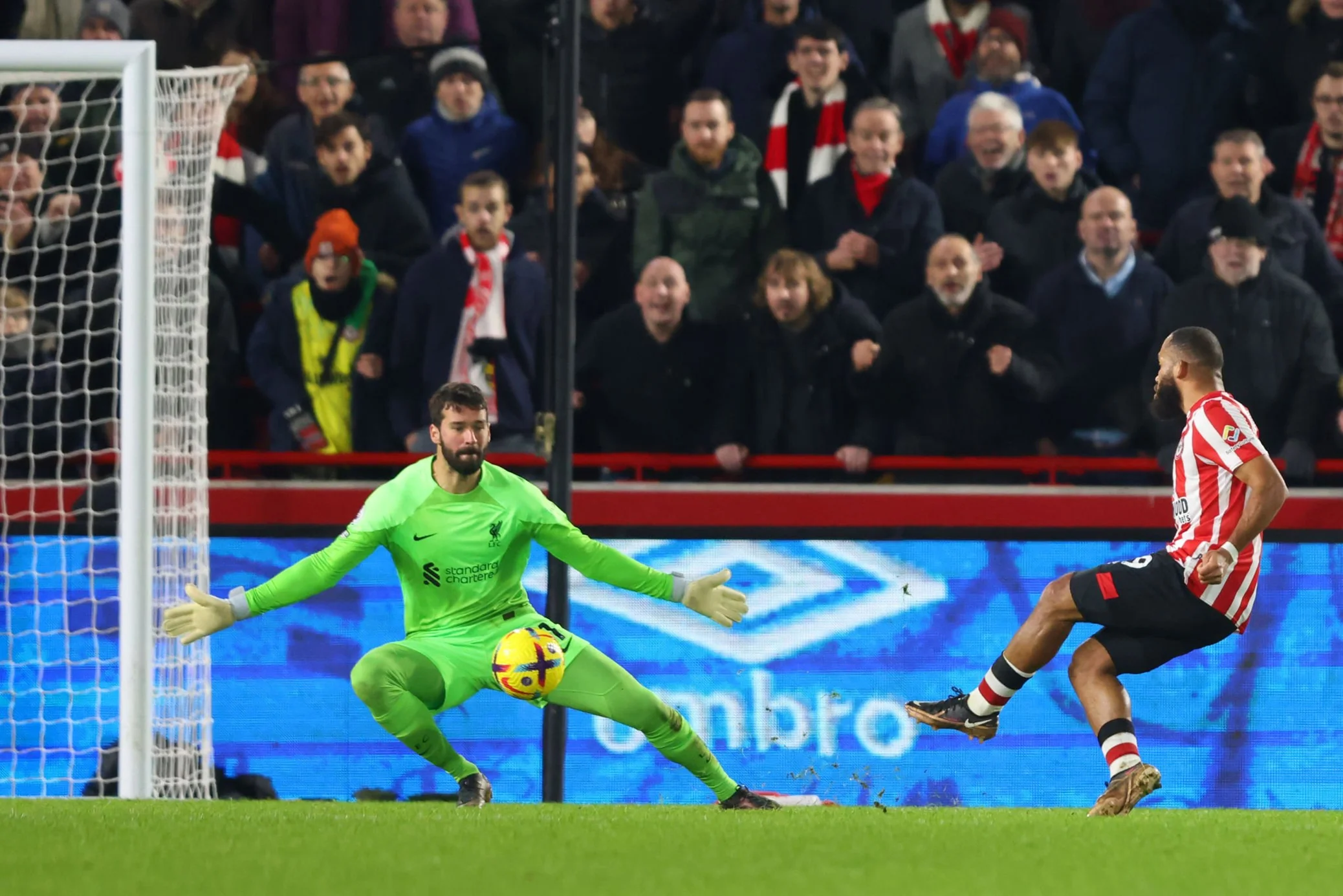 Натомість, Брентфорд раз за разом тікав у контратаки, особливо ефективно прориваючись через лівий фланг оборони суперника. Одна з них на 18-й хвилині завершилась ривком Мбеумо на побачення з Аліссоном – Браян пробив у ближній кут, але голкіпер парирував! Втім, подальша подача з кутового призвела до взяття воріт. Мбеумо виконав навіс, а м'яч рикошетом від Конате залетів у сітку. 1:0!