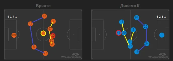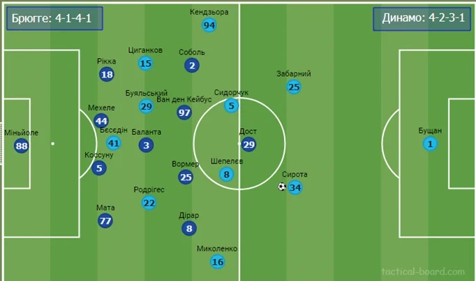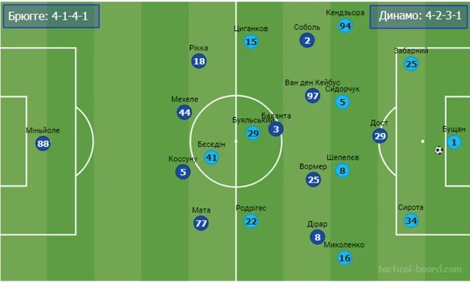 Загалом, стартовий склад Брюгге, з урахуванням усіх втрат, був достатньо передбачуваний, як і тактична схема – 4-3-3. Хоча саме у цьому матчі базова структура "чорно-синіх" більше відповідала формації 4-1-4-1. Соболь і Дірар не були явними, класичними вінгерами.
