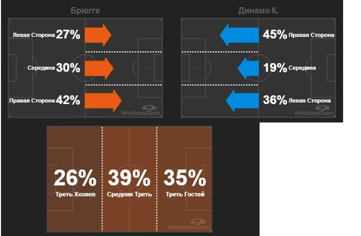 Більшість своїх атак Брюгге намагався проводити правим флангом, де активними були Мата та ближня "вісімка" – Вормер. Динамо взагалі 45% своїх атакувальних дій проводило на своєму правому фланзі. Через центр кияни майже не атакували. На цю вертикальну зону доводилося всього 19% атак.