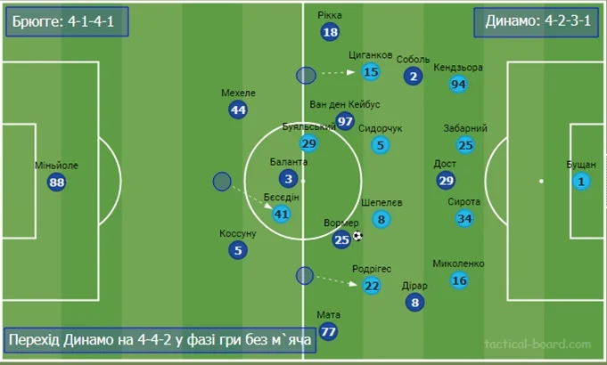 На схемі вище – класична перебудова Динамо у фазі гри без м'яча. Циганков та Родрігес сідали у лінію до опорних і утворювали структуру 4-4-2.