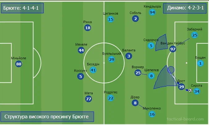 На схемі вище – структура високого пресингу Брюгге. Попереду були Дост і ліва "вісімка" Ван ден Кейбус. Вони почергово атакували ближнього центрбека киян, коли той отримував м'яч, перекриваючи лінію можливої передачі на опорних.