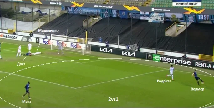 Взагалі, моменти біля воріт Бущана виникали в основному після подач з флангів та контратак у другому таймі, коли Динамо вже ризикувало. Порівняно з першим матчем, було помітно, що кияни провели роботу над грою у захисті при стандартах. Якщо бельгійці і били, то, як правило, із боротьби. Найнебезпечніший момент у цьому плані – удар впритул у виконанні Доста. Але він виник випадково. Зверніть увагу на скріншот. Миколенко та Дост зіштовхнулися у штрафному і обидва впали. М'яч відскочив на правий фланг атаки Брюгге, де Родрігес через інцидент із Миколенком залишився один проти Вормера та Мати. Гравці Брюгге скористалися ситуацією і майже забили гол.