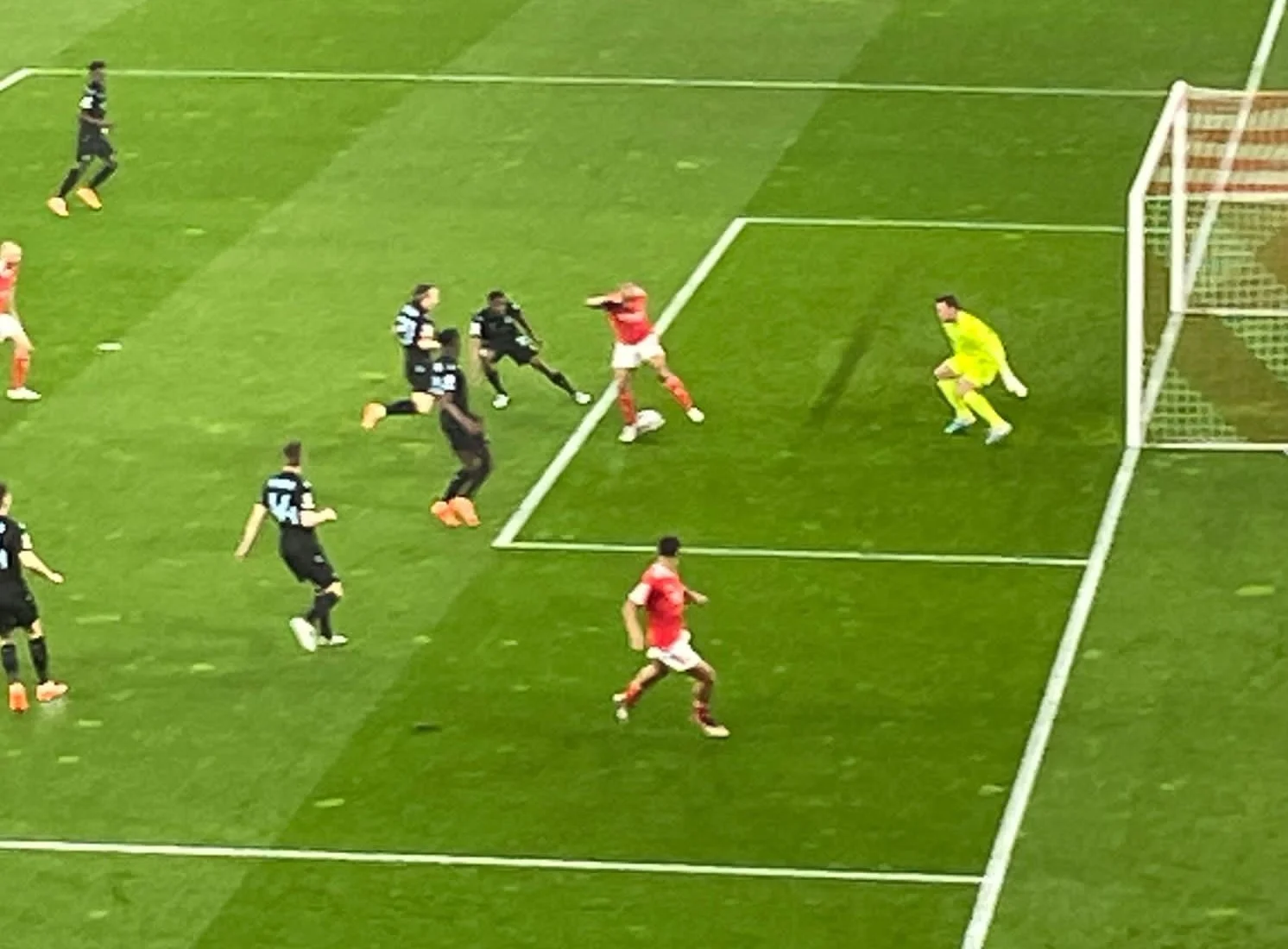 Один із найкращих моментів було змарновано на 20-й хвилині, коли спрацював пресинг Бенфіки. Грімальдо підхопив сферу й увійшов на лівий край штрафного, звідки виконав передачу під удар Маріу. Жоау вистрілив у правий нижній, але влучив у захисника на лінії – а від нього м'яч відскочив у ногу Міньйоле! Подальша атака другим темпом завершилась неточним пострілом.
