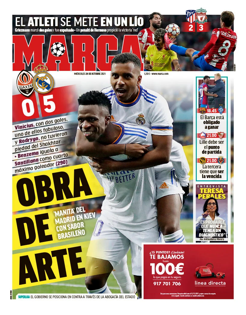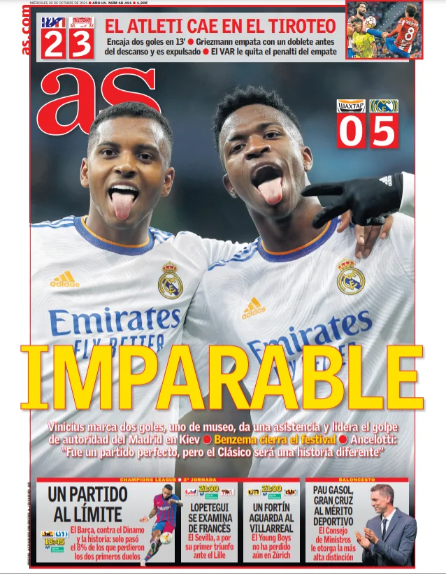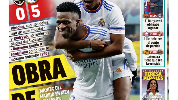 Обкладинка AS – теж для мадридських бразильців: "Вінісіус нестримний". Опальний Томас Ронсеро присвятив кілька зворушливих рядків 21-річному форварду. "Віні – суперзірка. Минуть роки, і дітлахи попросять мене сісти в машину часу: "Пане Ронсеро, ви пам'ятаєте той марадоніанський гол в Україні?". Шахтар вийшов на поле з вісьмома бразильцями, Мадрид – з чотирма (Мілітао, Каземіро, Віні та Родріго). Це виглядало як "Шахтар Мінейро" проти "Реала Сан-Паулу". Але ні, це була Ліга чемпіонів, найкраща футбольна вітрина на клубному рівні. Саме тут розкривається хлопчина, який ганяв м'яча у порваних кедах на вулицях Сан-Гонсало, поблизу Ріо-де -Жанейро.