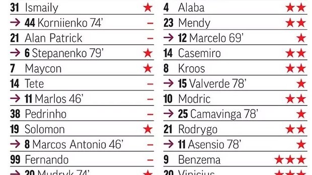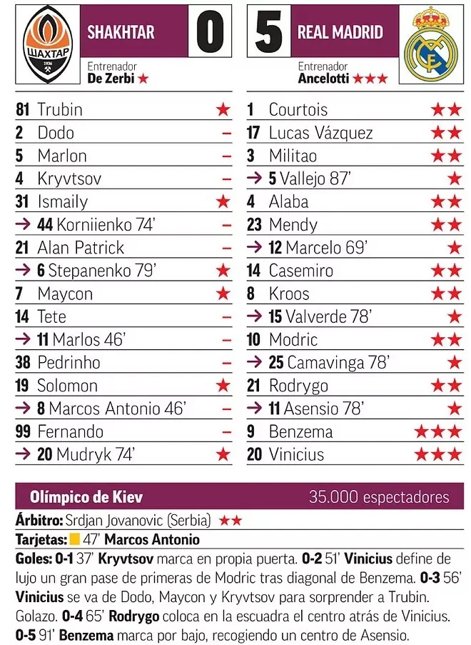 Мадрид задихається у таких матчах, тим паче, що підопічні Анчелотті не надто якісно пресингують. Проте, "бланкос" пристосувалися і провели хорошу гру. На перших хвилинах обидві команди діяли обережно, але після автоголу Кривцова гра розкрилася", – пише Marca. Вінісіус і Бензема отримали найвищі бали, натомість відразу 10 футболістів Шахтаря залишилися без оцінки (0).