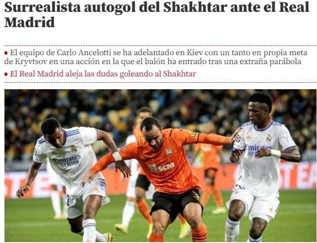 А ось каталонська преса застерігає Барсу перед недільним Ель Класіко. Гольова феєрія у Києві зовсім не подобається Mundo Deportivo. "Вінісіус здетонував Олімпійський дублем". Вже традиційно видання намагається трохи применшити заслуги "бланкос". Основний аргумент – нібито мадридський фарт в ЛЧ. "Реал відкрив рахунок завдяки сюрреалістичному автоголу Кривцова. Захисник Шахтаря намагався випередити Бензема, утім все пішло шкереберть – і незрозуміла парабола, і Трубін, який вийшов з воріт. Ба більше, VAR втрутився через можливий офсайд у француза. Дуже сумнівне положення – міліметри на користь Мадрида".