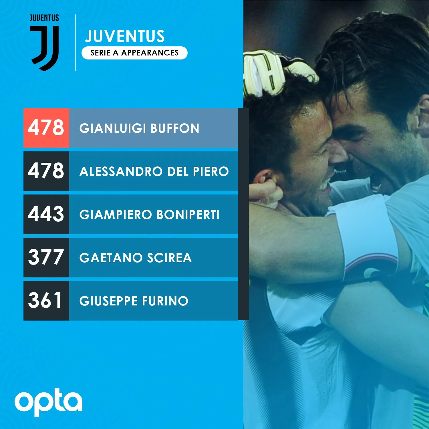 Матч 16 туру Серії А проти Удінезе став для Буффона 478 у Серії А за Ювентус. Таким чином Джанлуїджі повторив рекорд Алессандро Дель П'єро – ніхто не провів у чемпіонаті більше ігор за "стару синьйору".