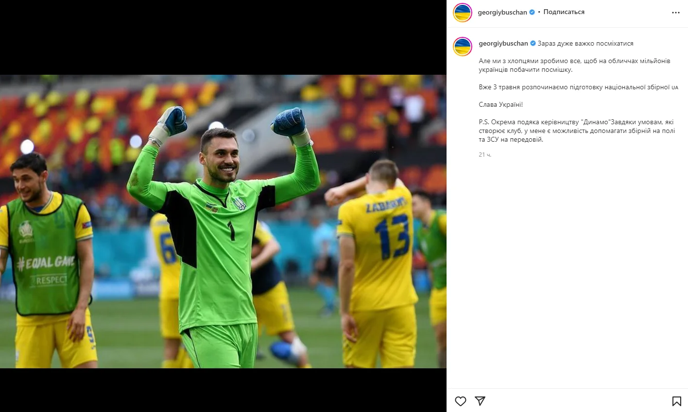 P.S. Окрема подяка керівництву Динамо. Завдяки умовам, які створює клуб, у мене є можливість допомагати збірній на полі та ЗСУ на передовій", – написав Бущан на своїй сторінці в соціальній мережі Instagram.