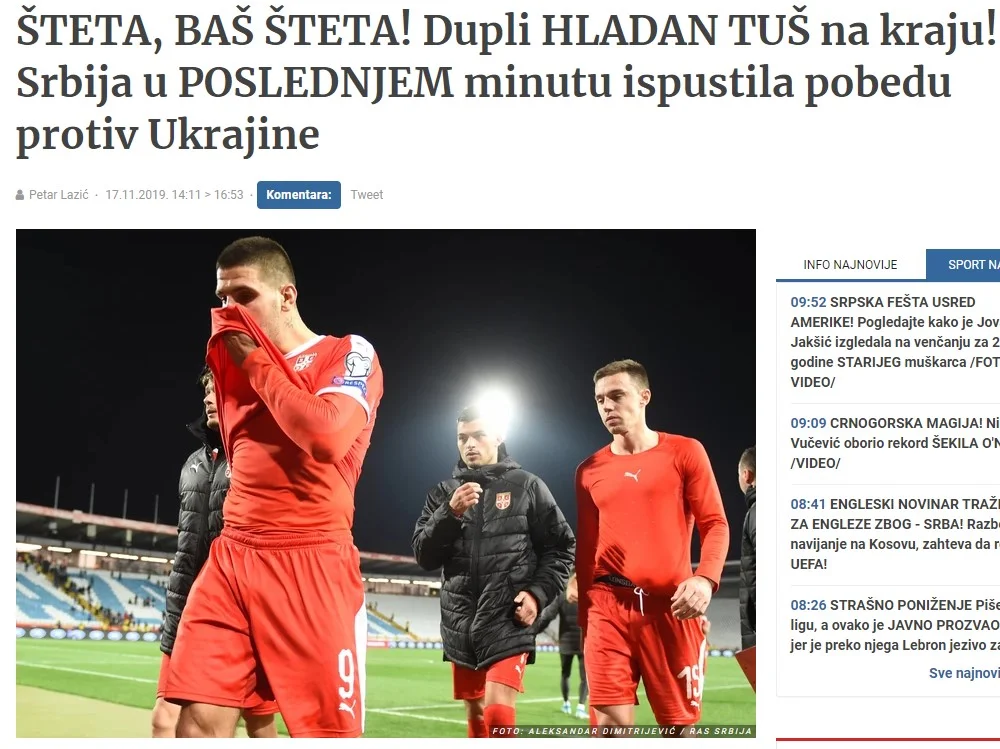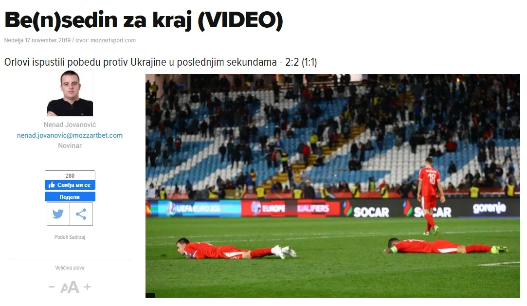 "Лише пів хвилини відділяли Сербію від першого історичного тріумфу проти України після 6 поразок у 6 матчах. На фініші відбору "орли" мали в кишені бажані три очки, однак у компенсований час Бєсєдін своїм голом оформив нічию. Ще перед цим приголомшливим ударом стало зрозуміло, що на Євро доведеться продиратися в березні, адже Португалія переграла Люксембург.