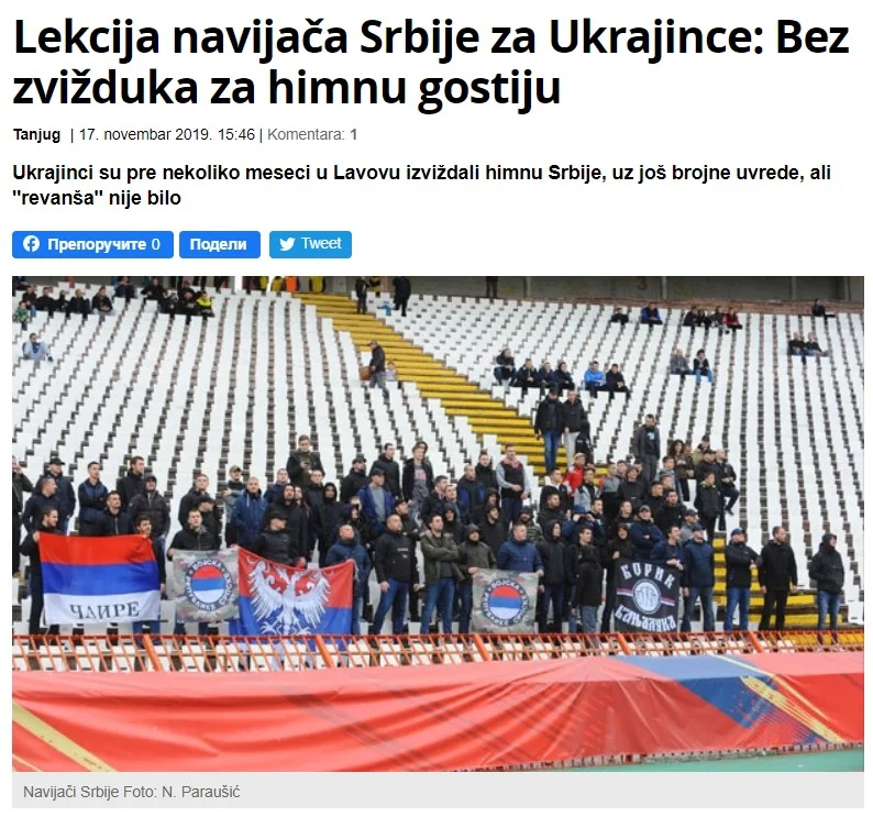 "Декілька місяців тому українці засвистали гімн Сербії у Львові, додавши до цього купу образ, але "помсти" не було. Сербські фани дали урок Україні, пристойно зустрівши гімн цієї країни перед матчем у Белграді.
