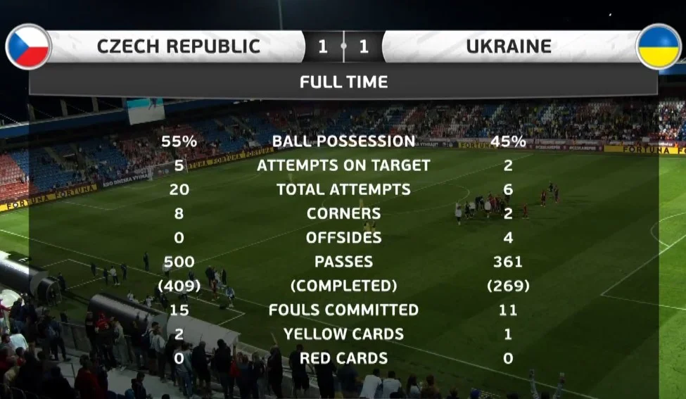Гложек рулеткою Зідана пройшов Шапаренка, Кочергіна та Тимчика. Добре, що у штрафному підстрахував Качараба. Кутові на диво нічого не приносять господарям. Довге вертикальне вкидання ауту. Сирота дуже вже довго думав і заносив ногу під виніс, різкіший Саділек перехопив і спокійно пробив повз Соболя. Бойко відверто виручає! Україна змушує чехів переважно до дальніх ударів. Але один з таких ударів на останній секунді приносить нічию. Соболь відкинув, форвард Бернлі Видра подякував – ідеальний постріл у дев'ятку.