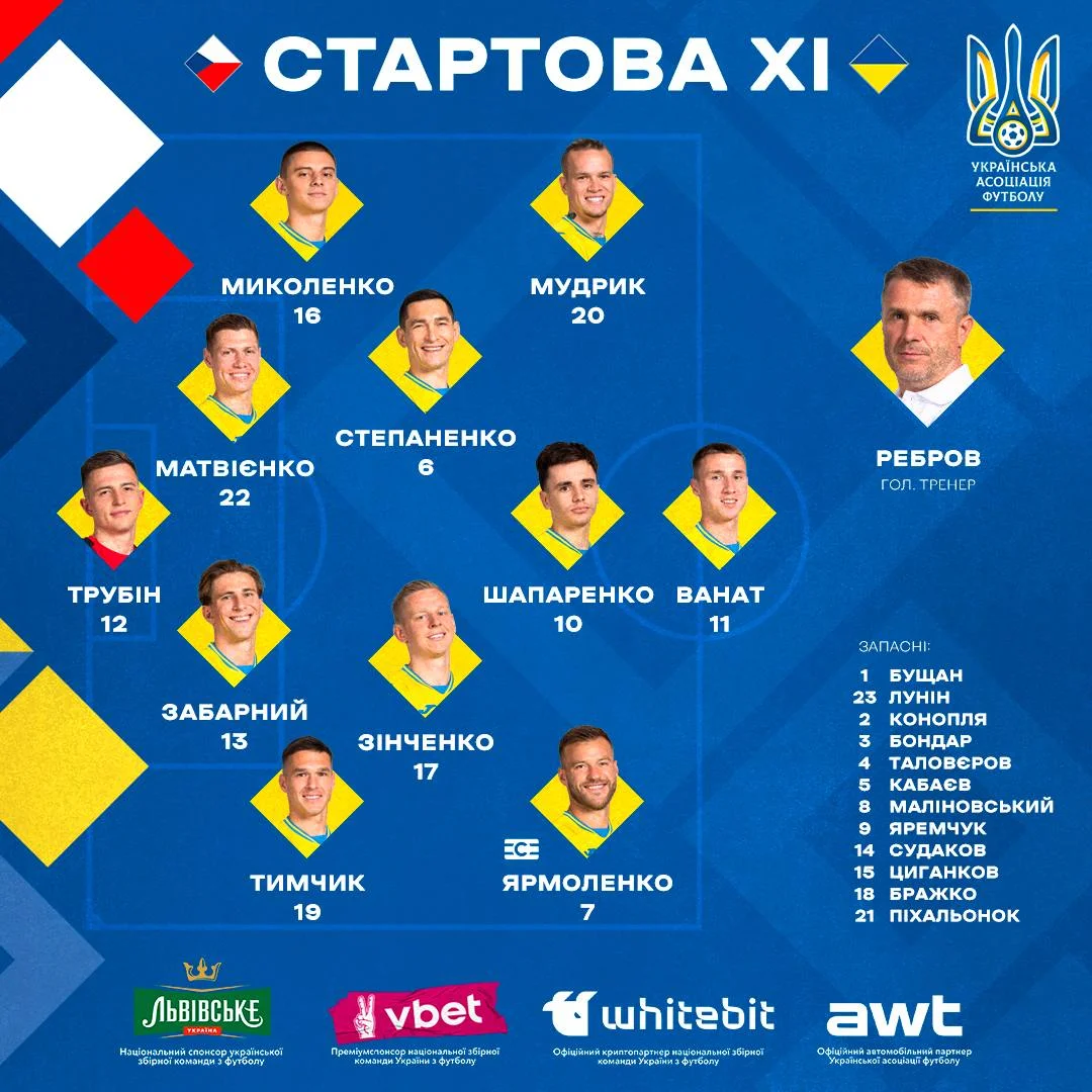 Україна: Трубін – Тимчик, Забарний, Матвієнко, Миколенко – Степаненко – Ярмоленко (к), Зінченко, Шапаренко, Мудрик – Ванат