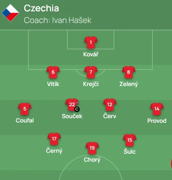 Чехія: Коварж – Вітік, Крейчі, Зелени – Цоуфал, Соучек (к), Черв, Провод – Черни, Хори, Шульц