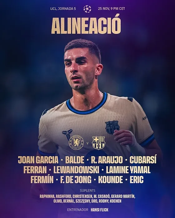 Гансі Флік не залишає місця для сюрпризів і випустить на поле очікуваний склад. Тренер Барселони повторює стартову одинадцятку проти Атлетіка (4:0), за винятком Араухо, який замінить Жерара Мартіна. В атаці Рашфорд і Рафінья вийдуть на заміну, а Ферран Торрес зіграє з перших хвилин завдяки дублю в останній грі Ла Ліги.