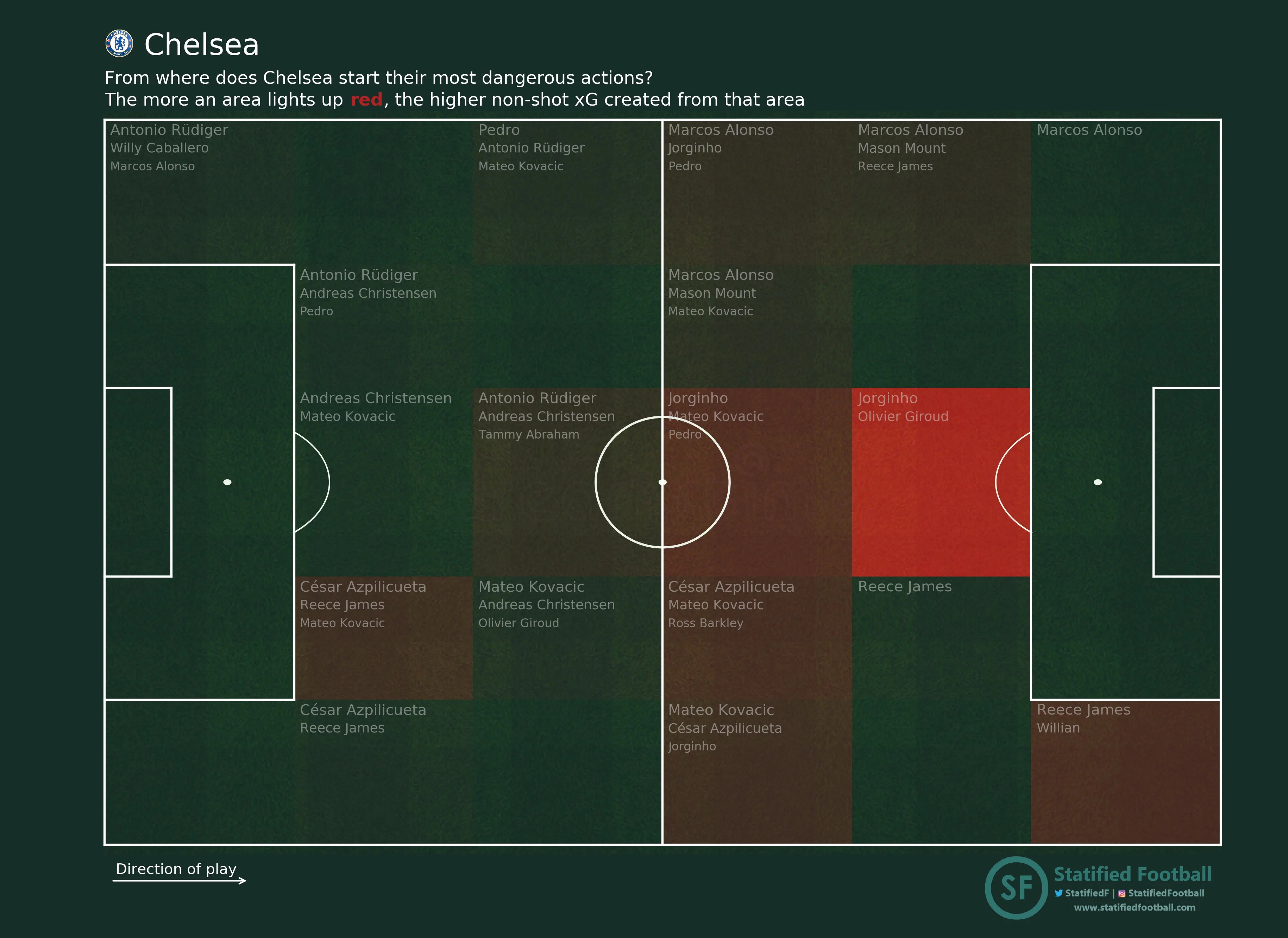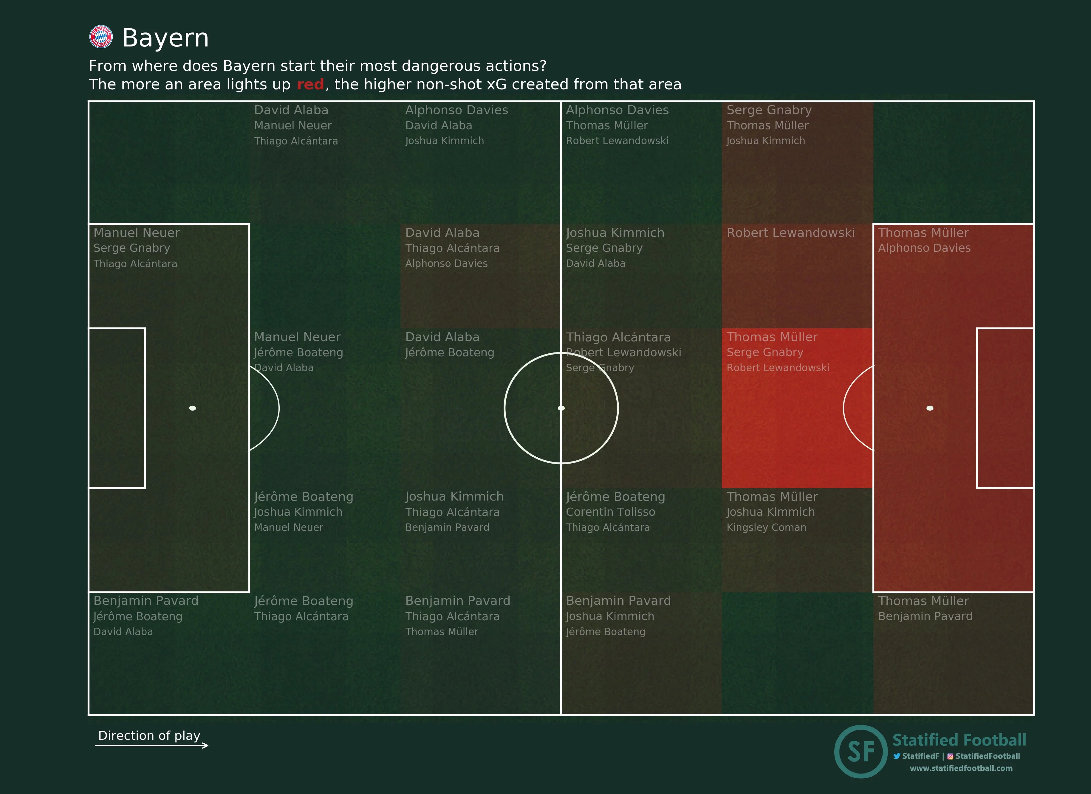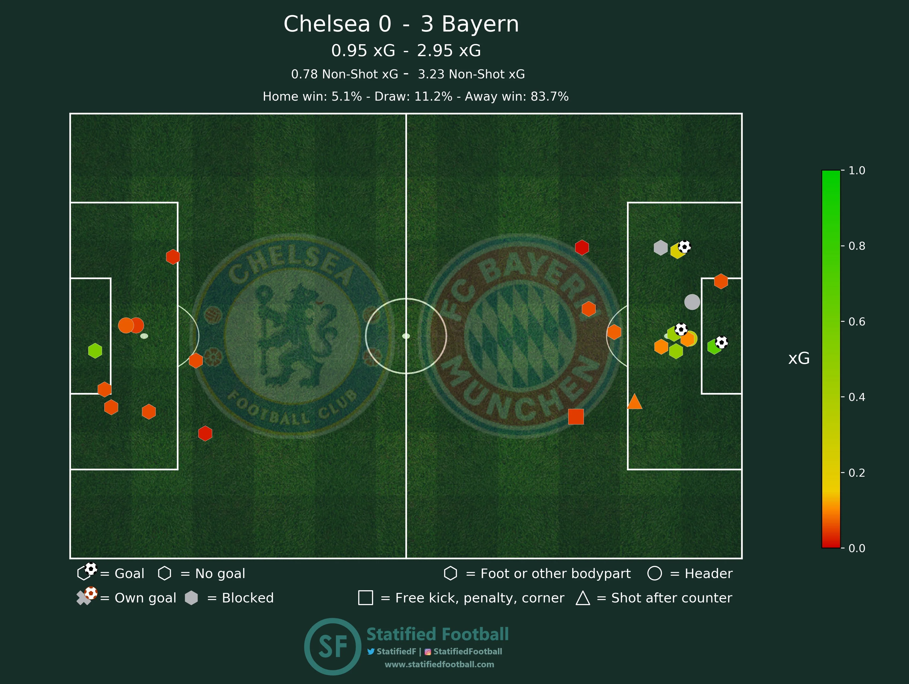 Ще більш яскраво про справедливість розгрому Челсі говорить карта зон, з яких команди розпочинали свої найбільш небезпечні атаки. Лондонці стартували з центру поля та із конкретної зони 14 перед штрафним, а той час як мюнхенці домінували на всій площині чужої третини поля та у карному майданчику.