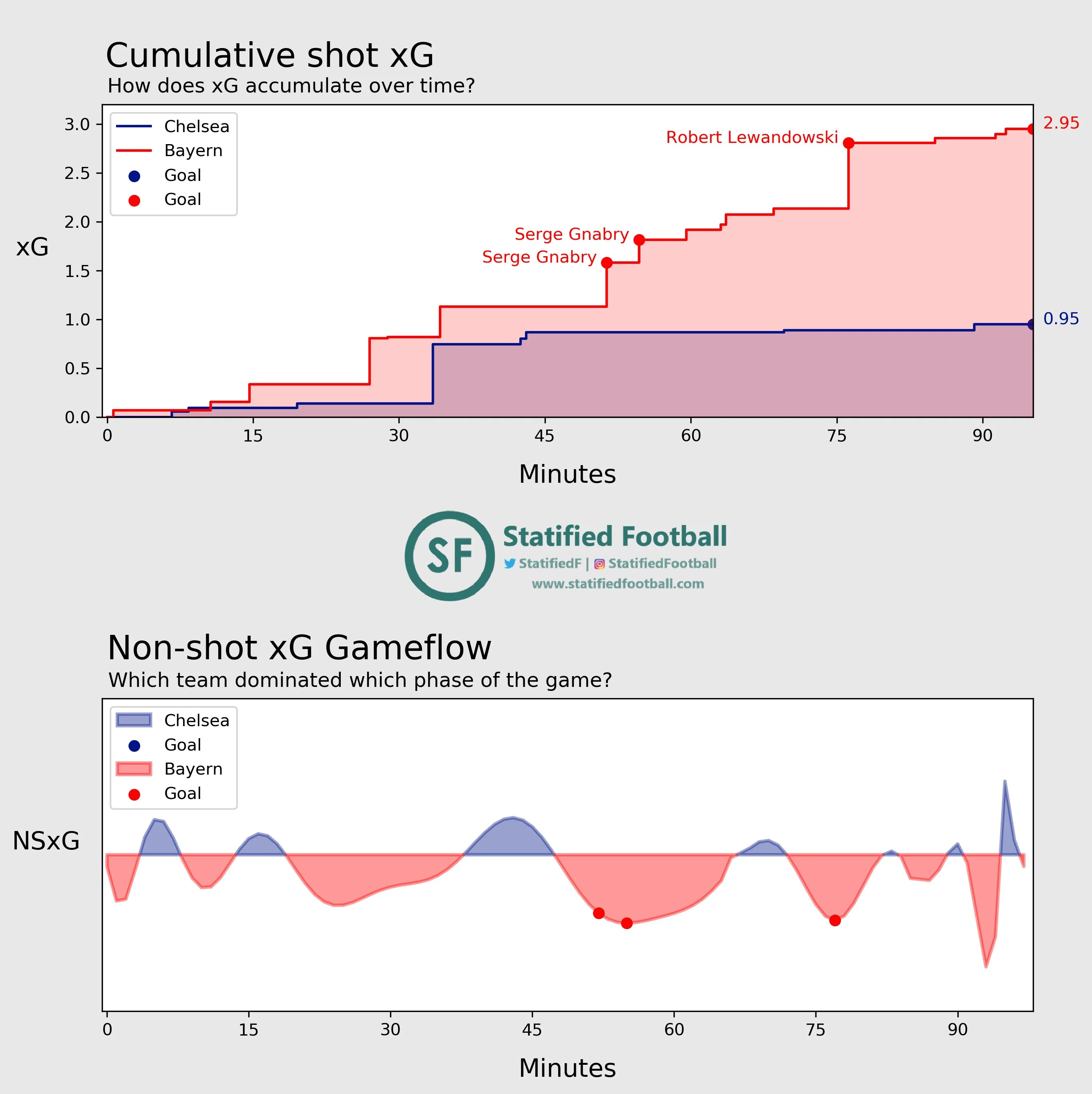 Показовою є статистика очікуваних голів. Портал Infogoal говорить про цифри 1,16 - 3.11 на користь Баварії, а Statified Football – 0,95 проти 2,95. При цьому останній виділяє доволі рідкісний показник xG без ударів, за яким мюнхенці ведуть з рахунком 0,78 - 3,23. Різницю між якістю моментів та тривалість домінування Баварії красномовно демонструють карти: