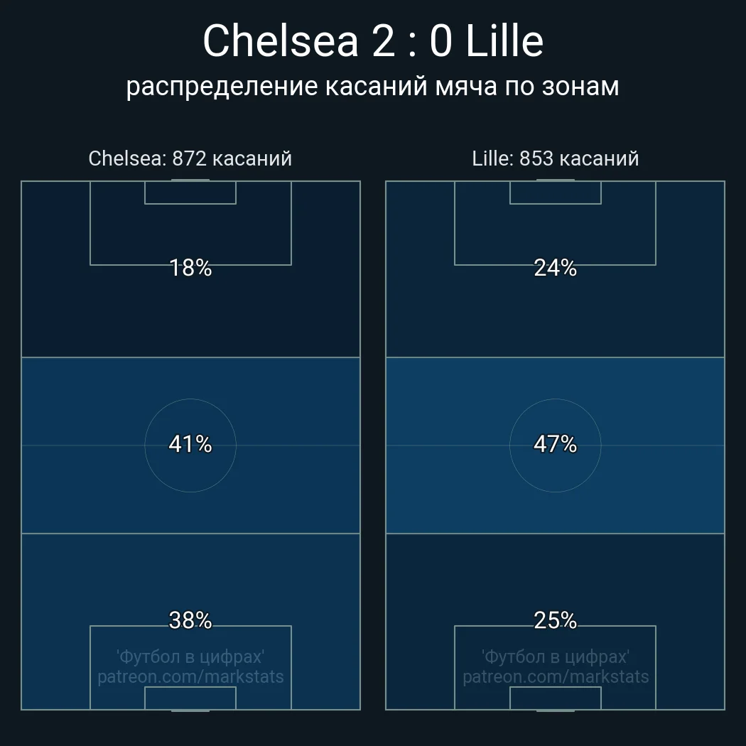 Лілль грав агресивніше й нахабніше, демонструючи досить пристойну якість гри. Тим не менш, на жодному з етапів матчу не виникало відчуття втрати контролю з боку Челсі, а у ключових показниках лондонці виявили значно вищу ефектнивність. Зокрема, всі свої удари вони провели з меж штрафного, награвши на вдвічі вищий xG – 1,41 vs 0,68. Перший же постріл було завдано з 5-ти метрів, другий пішов у площину, а третій завершився взяттям воріт. Це і є клас.