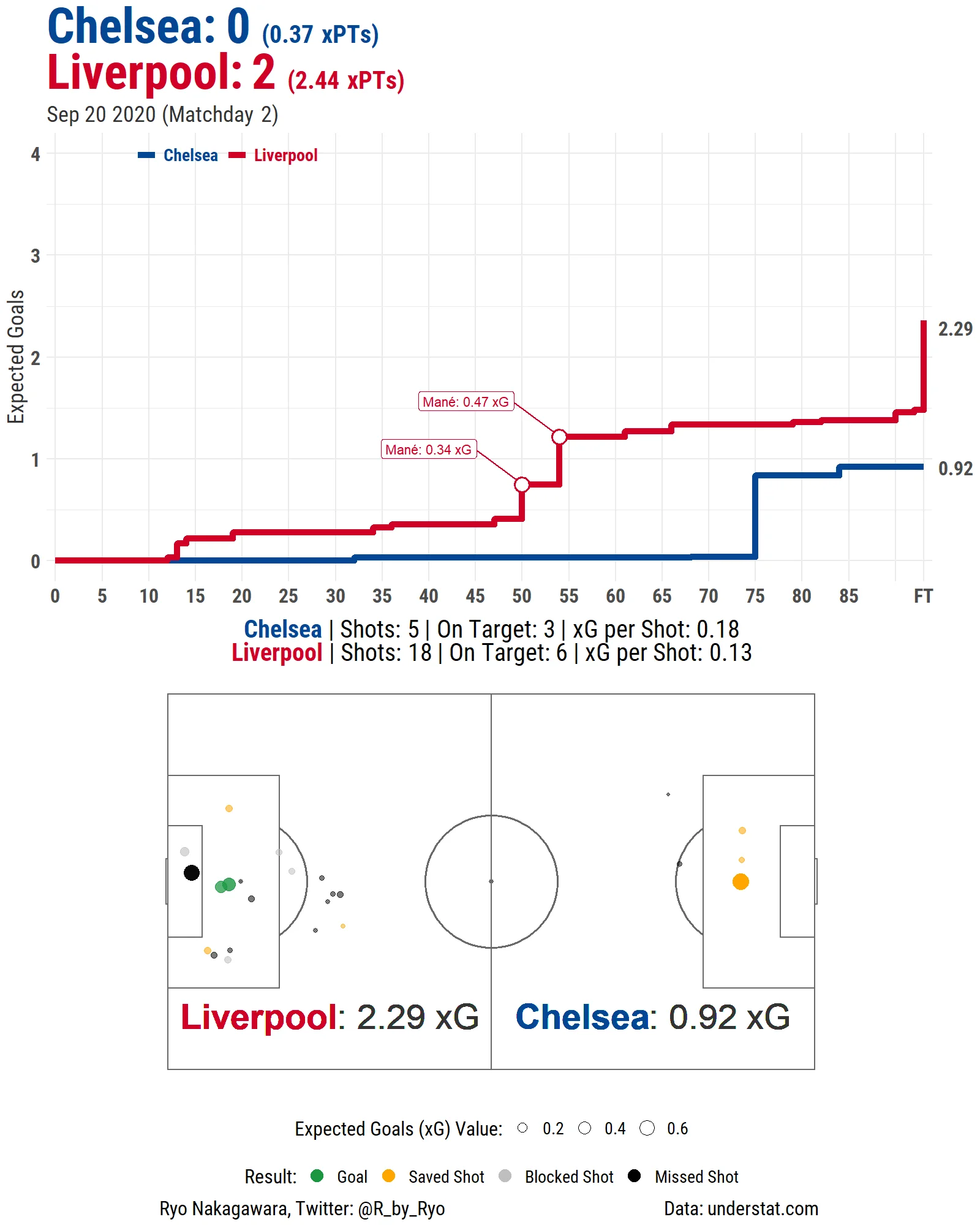 Челсі намагався виманювати Ліверпуль у пресинг, після чого в одну-дві передачі м'яч доправлявся в передню лінію. "Сині" таким чином вибігли в кілька перспективних атак (в основному завдяки Канте, який класно протягував м'яч, вигравав єдиноборства та діяв сміливіше за всіх партнерів), однак завершити їх не вдавалося. Без пенальті господарі напрацювали на 4 удари (три з них, коли все в матчі стало зрозуміло) та 0.16 xG – дуже слабо. Вилучення відібрало у Челсі будь-які шанси на успіх, але й у повних складах команда виглядала імпотентно.
