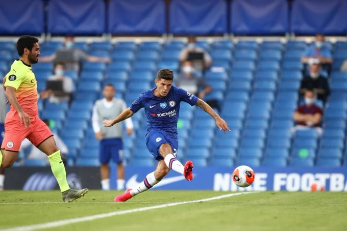 В останній третині першого тайму Челсі ожив. Так, на 32-й хвилині господарі розкатали цілу комбінацію з двома гострими ударами з країв штрафного – постріл Маунта зрізали на Барклі, а той потужно пробив під ближню стійку. Едерсон спочатку парирував цю спробу, а потім врятував після замикання подачі з кутового у виконанні Крістенсена. На 36-й же "пенсіонери" вийшли вперед завдяки ляпу Менді та Гюндогана: прийнявши винос після штрафного в центрі поля, вони не розібралися, зіткнулися й подарували м'яч Пулішічу – Крістіан почав прорив, знову обіграв Менді, вийшов сам на сам і поклав "круглого" у правий нижній кут. 1:0!