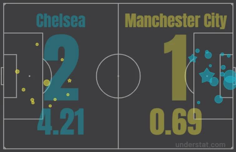 Челсі також не вражав градом небезпечних епізодів, але коли маятник переваги хитався в бік лондонців, оборона гостей розвалювалася на очах. Моменти Сіті були робочими, моменти Челсі – гольовими. Навіть без урахування розстрілу Фернандінью перед другим взяттям воріт (три влучання потягнули на 2,02 xG), у "пенсіонерів" залишиться ще 2,19 очікуваних голів, або ж три нереалізованих виходи сам на сам, небезпечний удар Барклі з гострого кута, передача Едерсона на Маунта з пострілом повз ближній та відбитий закручений м'яч Педро.