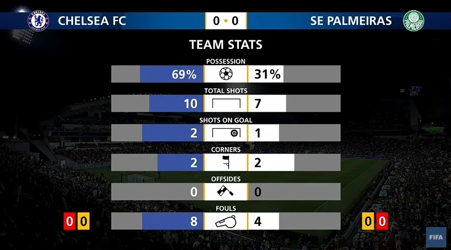 Палмейрас можна було б сміливо хвалити за перший тайм, якби не прогріхи останніх миттєвостей. Захист відіграв непогано, півзахист вдало підстраховував і пресингував, що інколи призводило до помилок "синіх", а напад витискав максимум з кількох нагод. Та все ж перевага Челсі була більш відчутною, що й підтверджує статистика.