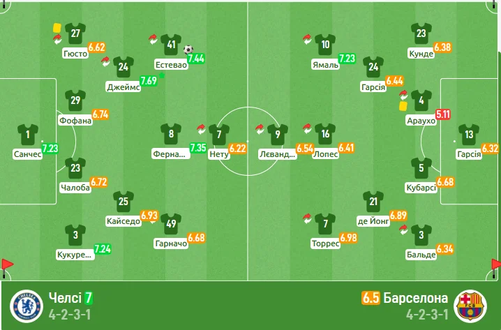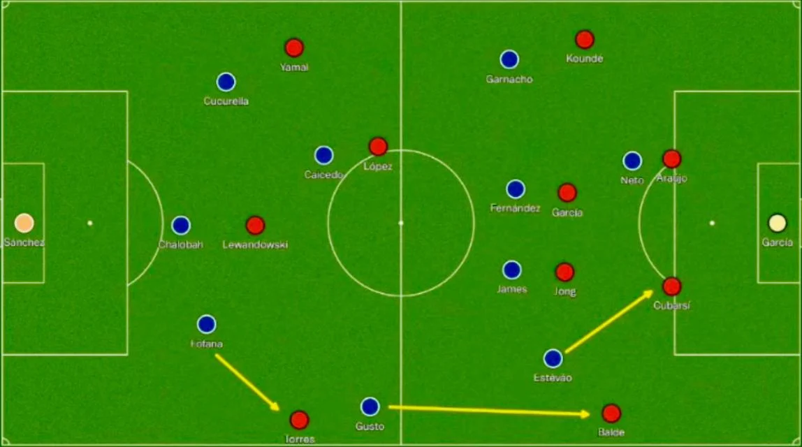 Челсі тероризував Барселону інтенсивним зонно-персональним пресингом. Трійка в центрі працювала з трійкою гостей персонально, а захисники "синіх" отримували чисельну перевагу над форвардами. Передача на Кубарсі виступала тригером для старту тиску – на Пау висувався Естевао, Гюсто атакував Бальде, а Фофана зміщувався ближче до Торреса.
