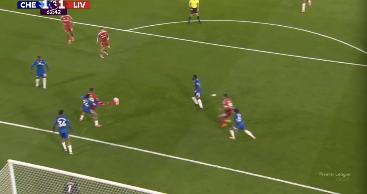 Саме так лондонці й відкрили рахунок. На 14-й хвилині Енцо Фернандес витягнув на себе Гравенберха, залишивши Макаллістера самотнім проти Гюсто та Кайседо в гігантській дірі. Жоден із центрбеків не висунувся вперед, аби заповнити розрив, а Салах взагалі вимкнувся з епізоду. Далі – справа техніки.