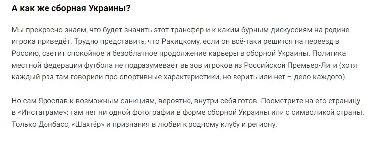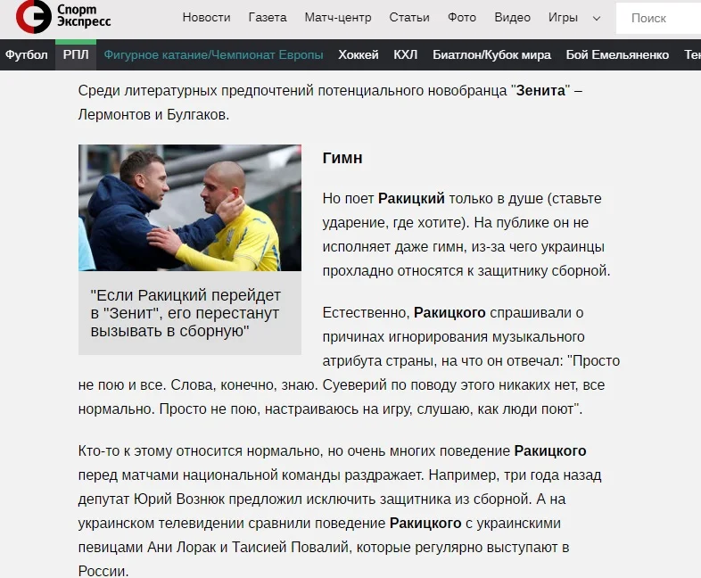 "Навіщо Ракицькому Зеніт? Ярослава в Україні недолюблюють та звинувачують у тому, що він не співає гімн своєї країни перед матчами національної збірної. У своєму Instagram він викладав масу фото у формі Шахтаря, і жодної – в футболці збірної України.