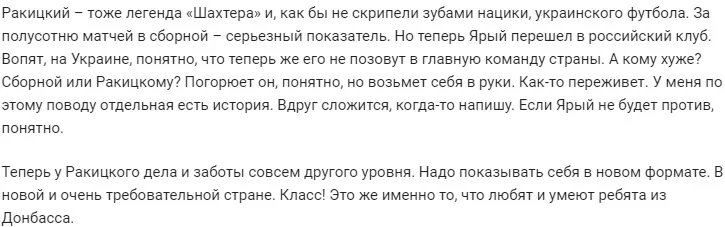 Ракицький – легенда Шахтаря, як би не скрипіли зубами нацисти українського футболу. Більше півсотні матчів у збірній України – серйозний показник. Але тепер Ярик перейшов у російський клуб. Волають, в Україні, зрозуміло, що тепер же його не покличуть в головну команду країни. А кому гірше? Збірній чи Ракицькому? Погорює він, зрозуміло, але візьме себе в руки. Якось переживе. У мене з цього приводу окрема є історія. Раптом складеться, колись напишу. Якщо він не буде проти, зрозуміло.