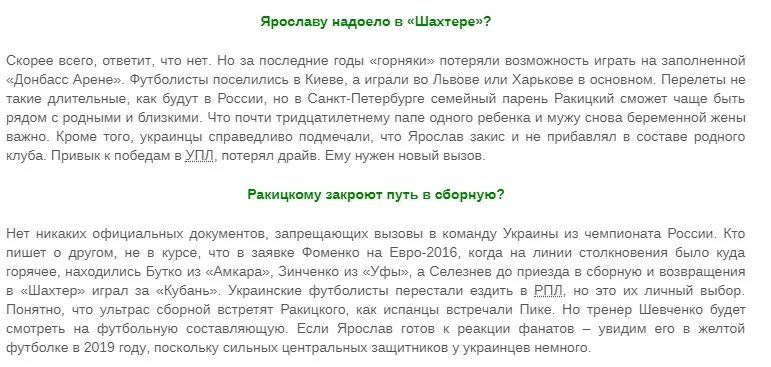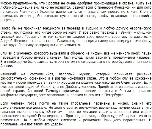 Ми прекрасно знаємо, що буде означати цей трансфер і до яких бурхливих дискусій на батьківщині гравця приведе. Важко уявити, що Ракицькому світить спокійне і безхмарне продовження кар'єри в збірній України. Політика місцевої федерації футболу не передбачає виклик гравців з Російської Прем'єр-Ліги (хоча кожен раз там говорили про спортивні характеристики, але вірити чи ні – справа кожного).
