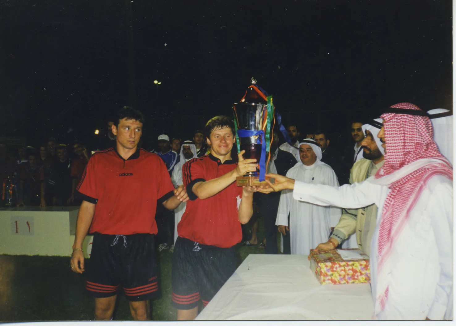 Зате є знімок, датований лютим 1999-го. Зроблений він в Об’єднаних Арабських Еміратах. Фірма "Спорт Кенеклем Інтернешнл" організувала міжнародний турнір, в якому взяли участь 8 команд. Карпати на шляху до трофею здолали єгипетський Мухта Ярад, марокканський АЛ Ашгаль, молодіжну збірну Казахстану та російську Носту.