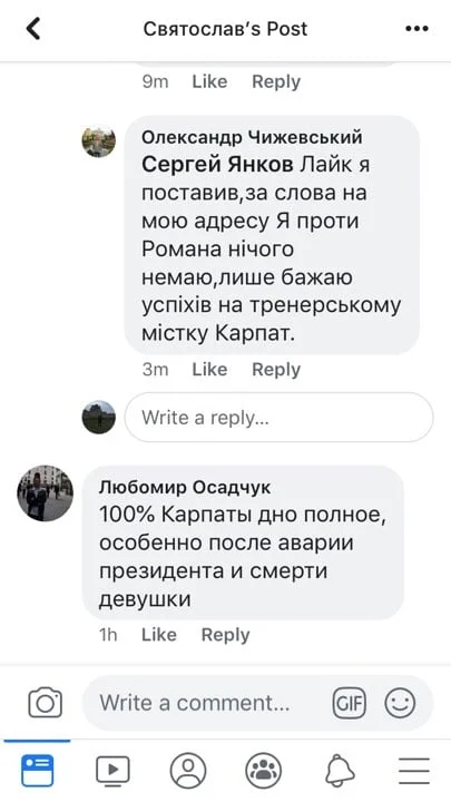 "Лайк я поставив за слова на мою адресу. Я проти Романа нічого не маю, лише бажаю успіхів на тренерському містку Карпат", – написав екс-тренер "зелено-білих".