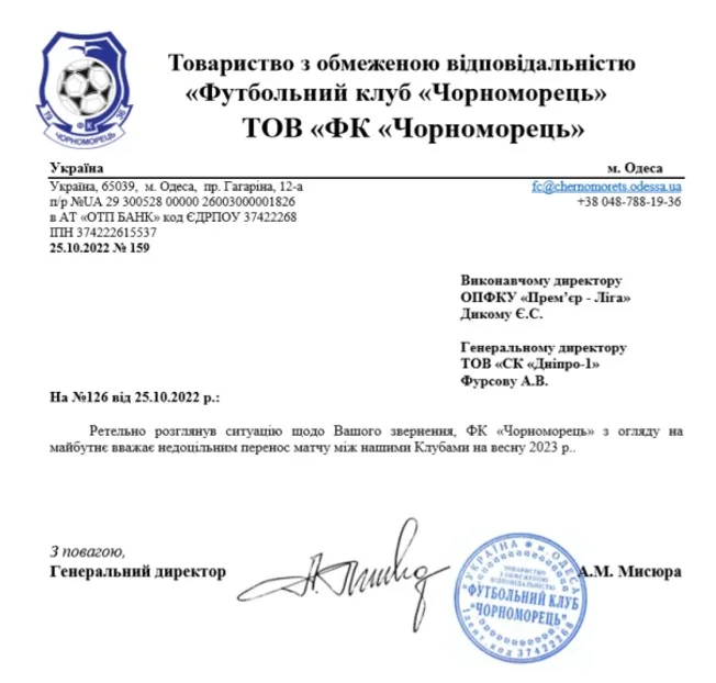 Чорноморець відмовився переносити гру на грудень, а тепер відхилив і друге прохання – зіграти навесні 2023 року. Таке перенесення "моряки" вважають недоцільним, йдеться у заяві одеського клубу.