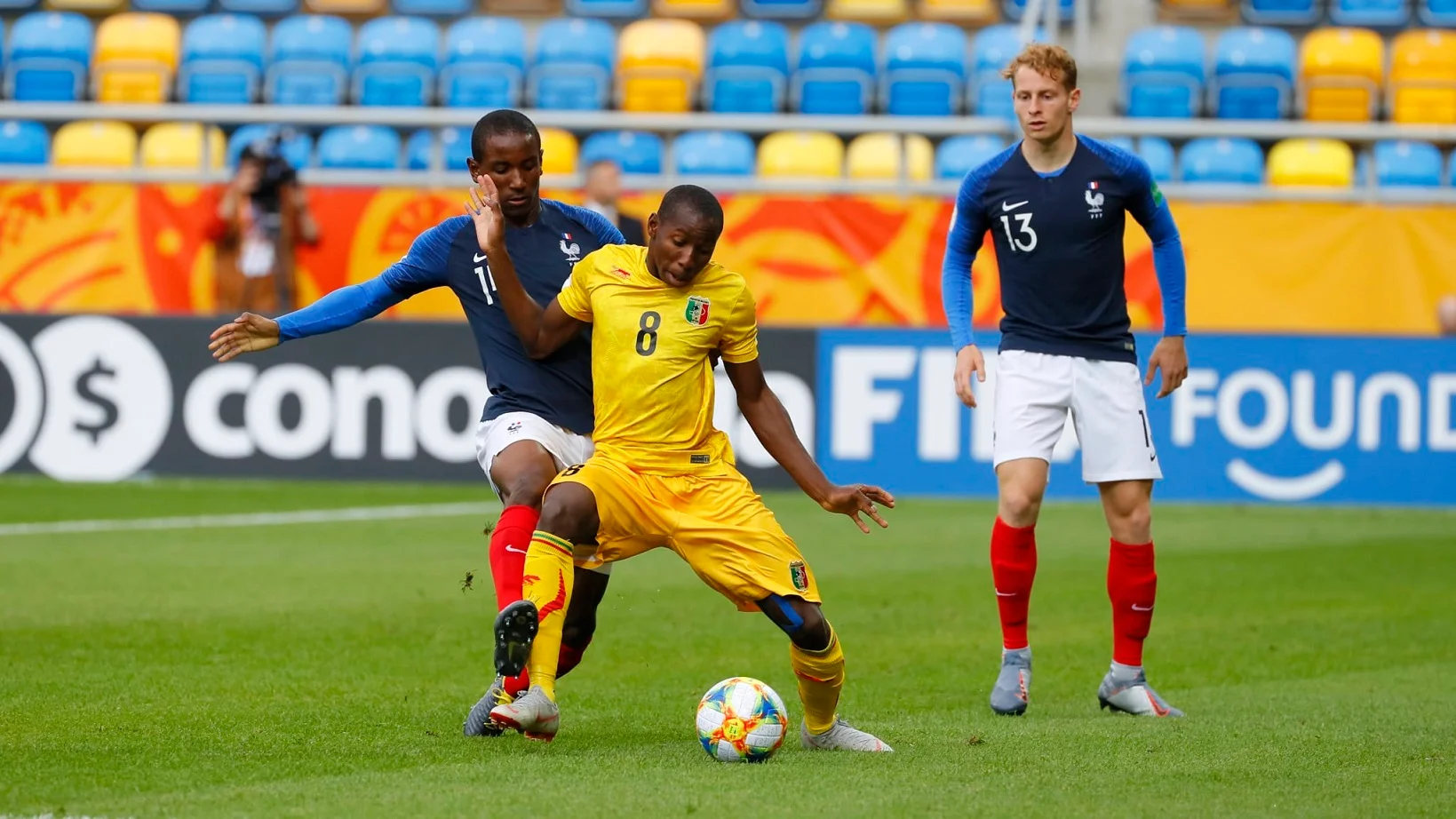 Французи так і не відчули жодного спротиву у групі Е. Команда Бернара Діомеде здобула три впевнені перемоги і легко пройшла в плей-офф. У останньому турі під натиском "галльських півнів" впала збірна Малі. Суперники обмінялися швидкими голами на початку зустрічі, але потім на полі цілковито домінували європейці. Серед всіх виділявся хавбек менхенгладбахської Борусії Мішель Кюїзонс, який знову відзначився голом. За французів також забивали Діабі з пенальті та Гуірі в кінцівці зустрічі. Гравці Малі спромоглися на ще один гол в останні секунди, але від поразки не врятувались – 2:3. Тим не менш, саме африканці стають другою командою групи Е, яка гарантувала собі місце у наступній стадії.