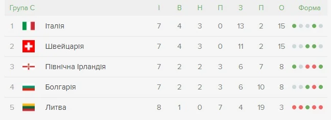 Італія та Швейцарія ведуть заочну боротьбу за перше місце. "Скуадра Адзурра" могла зняти майже всі питання в очному матчі, але Жоржінью на 90-й хвилині гри в Римі не забив пенальті та зберіг інтригу. В останньому турі італійці на виїзді зіграють з Північною Ірландією, а Швейцарія прийме Болгарію, яка кілька днів тому втримала нічию з Україною в товариському матчі.