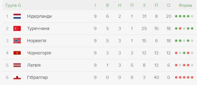 Єдина група, у якій на перше місце претендують одразу три команди. Нідерланди в суботу могли фінішувати першими за тур до фінішу, але примудрилися пропустити два м'ячі від Чорногорії впродовж останньої десятихвилинки. Тепер "ораньє" очікує складний вирішальний поєдинок проти Норвегії, яка сенсаційно втратила очки з Латвією.