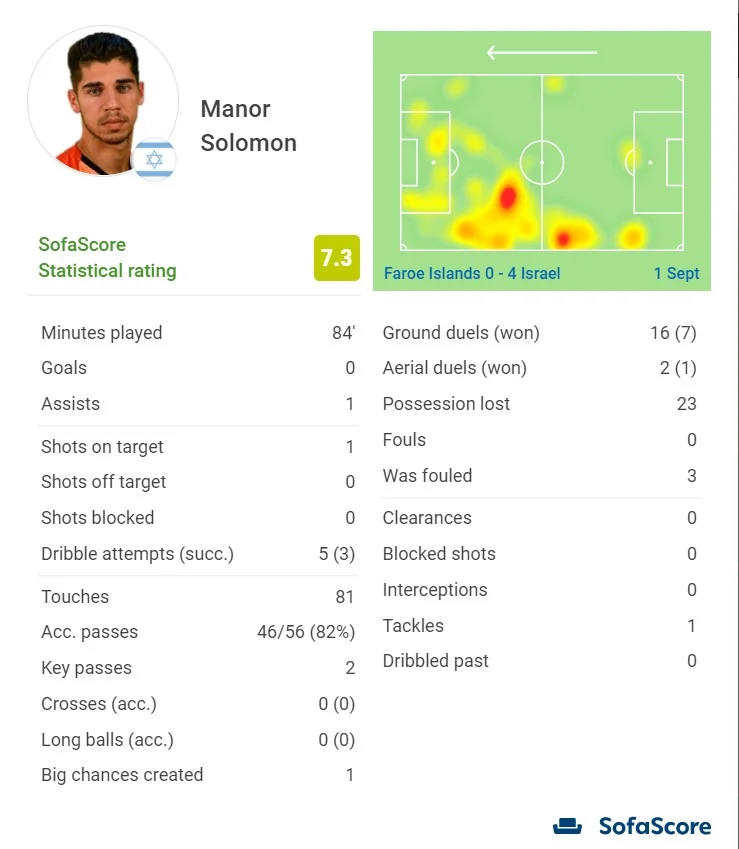 Ізраїль на виїзді розгромив Фарери. Манор Соломон відіграв 84 хвилини і записав собі в актив результативну передачу. Вінгер Шахтаря виконав класний рейд і прострілив на Даббура. Оцінка від SofaScore – 7.3. Ще три голи острів'янам забив Зехаві.