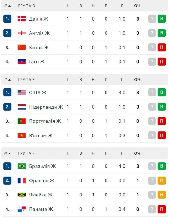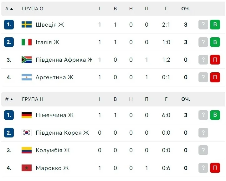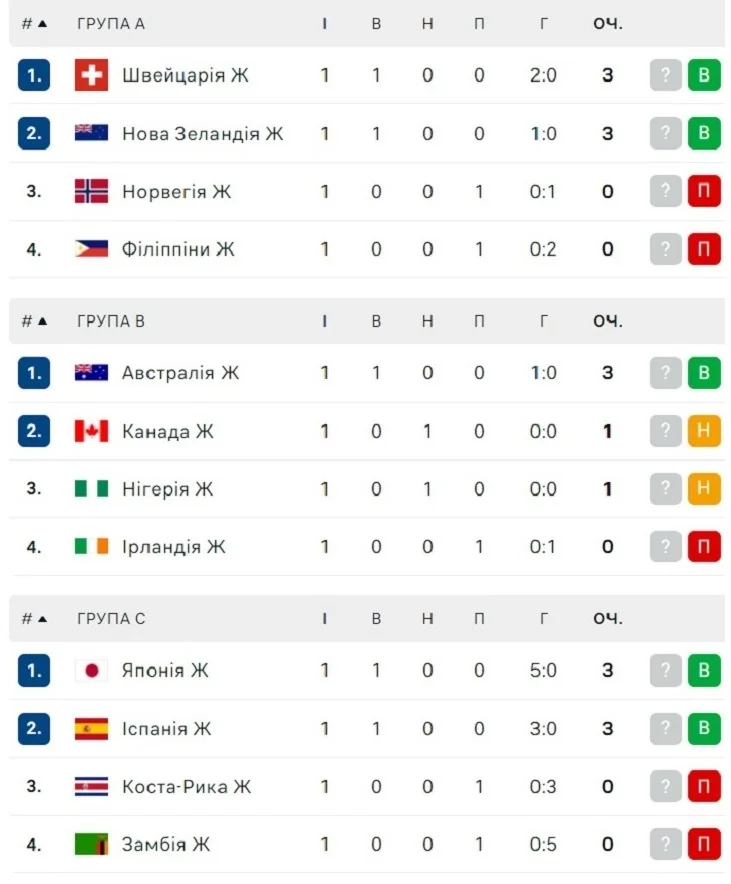 Турнірні таблиці жіночого чемпіонату світу 2023 після першого туру групового етапу: