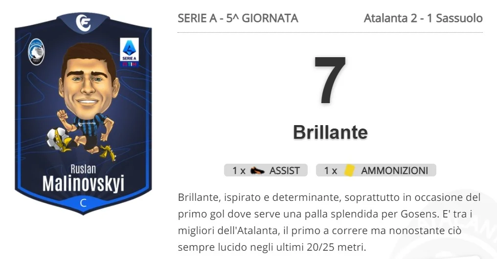 І тільки у Fantacalcio поставили Маліновському найвищу оцінку в команді – 7. Ще й компліментів відвантажили: "Блискучий, натхненний і рішучий. Особливо на перших хвилинах, коли вирізав на Гозенса ідеальний асист. Один з найкращих в Аталанті. Його замінили першим, але він до останнього залишався гострим у фінальній третині поля".