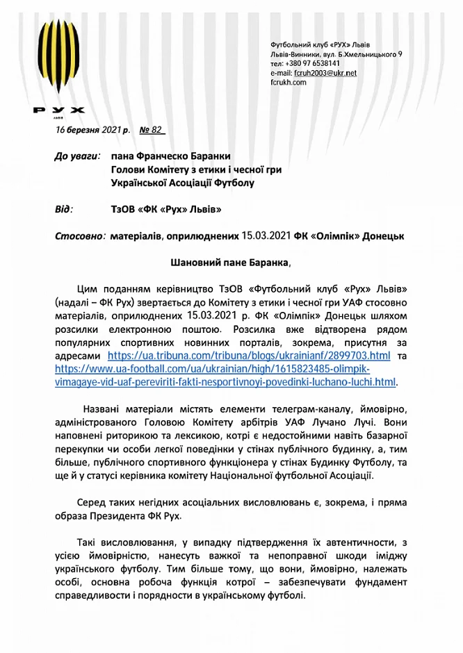 Рух звернувся до Комітету з етики та чесної гри щодо висловлювань голови Комітету арбітрів УАФ Лучано Лучі, зокрема, на адресу президента "жовто-чорних" Григорія Козловського, повідомляє офіційний сайт львів'ян.