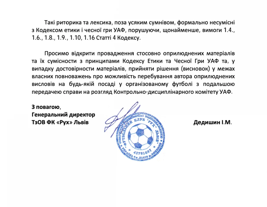 Нагадаємо, раніше подібного листа у Комітет надіслав і президент Олімпіка Владислав Гельзін. Керівника донецького клубу обурили висловлювання, імовірно, голови Комітету арбітрів у телеграм-каналі УАФ. За його словами, італієць у спілкуванні зі своїми підлеглими – арбітрами УПЛ, Першої та Другої ліг – не добирав слів: презирливо ставився до України, людей в українському футболі, керівників, функціонерів, гравців, тренерів, президентів і капітанів команд. Гельзін навіть анонсував прес-конференцію, на якій всі ці факти буде представлено громадськості.