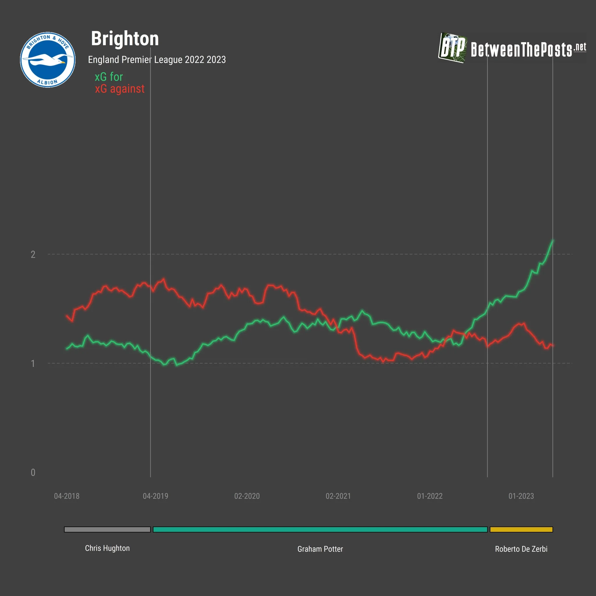 Брайтон грає, як великий клуб, грає сміливо, грає з позиції сили. У цьому сезоні АПЛ тільки Манчестер Сіті більше володіє м'ячем, тільки Арсенал частіше б'є по воротах. Де Дзербі нав'язує свій сценарій всім суперникам. Якщо не з перших хвилин, то в другому таймі, зробивши необхідні перестановки. Брайтон не просто здобуває перемоги, а буквально переграє інші команди.