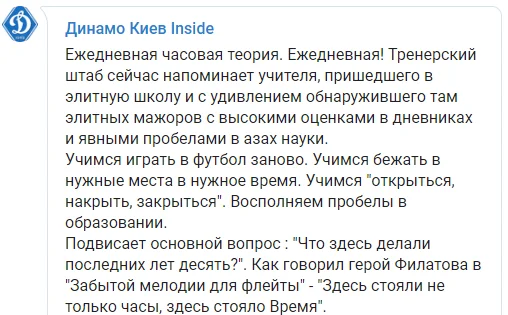 Ще один цікавий момент, який можна назвати унікальним у київському клубі, полягає в щоденних теоретичних заняттях, що тривають годину. Згодом інтенсивно перевіряють засвоєне уже на практиці. Під час гри з Вересом особливу увагу Луческу приділяв Буяльському, до якого теж були певні запитання. "Буя, Буя! Це твоя позиція. Віталій, Віталій! Говори!" – моментами в голосі тренера проскакували досить суворі нотки. "Чому так?" – а це вже дісталося Дуелунду. Данець забив, але моментами його дії наставник не міг зрозуміти.