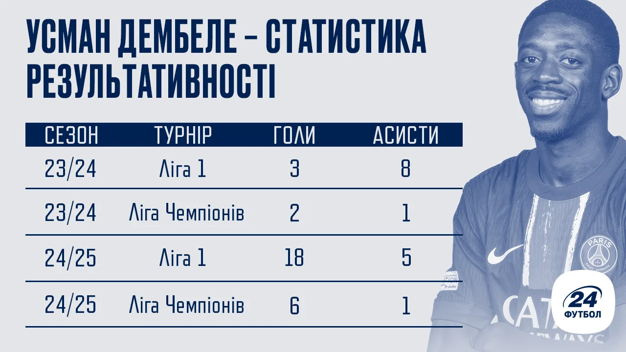 Старт сезону в Усмана теж був вдалим. За п'ять перших турів Ліги 1 він забив більше, ніж за весь сезон 2023/24 – чотири м'ячі проти трьох. Не постраждала і статистика асистів. Після шести турів Дембеле тричі допоміг відзначитися партнерам. Ставалися й невдачі. З кінця вересня до початку грудня за 11 матчів він забив лише гол, хоча додав до свого доробку декілька результативних передач. Утім, вплив на гру Усмана завжди високо цінував Луїс Енріке.